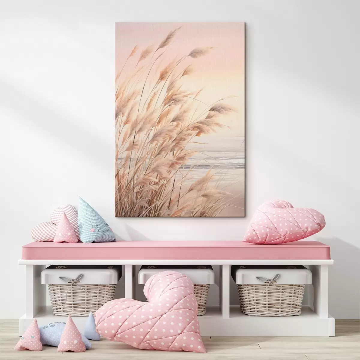 Tableau Herbe de la pampa avec une palette de couleurs orange pastel, un ciel rose pâle, un paysage paisible Nr s45934