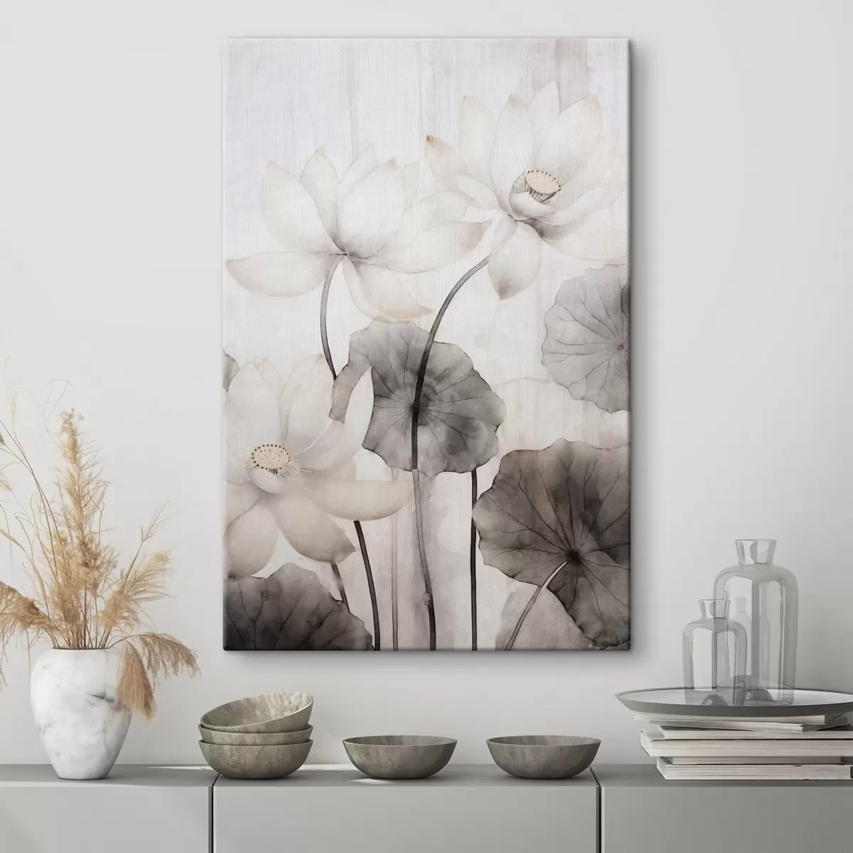 Tableau Fleurs de lotus blanches texturées avec des feuilles foncées, fond clair, design minimaliste Nr s45937