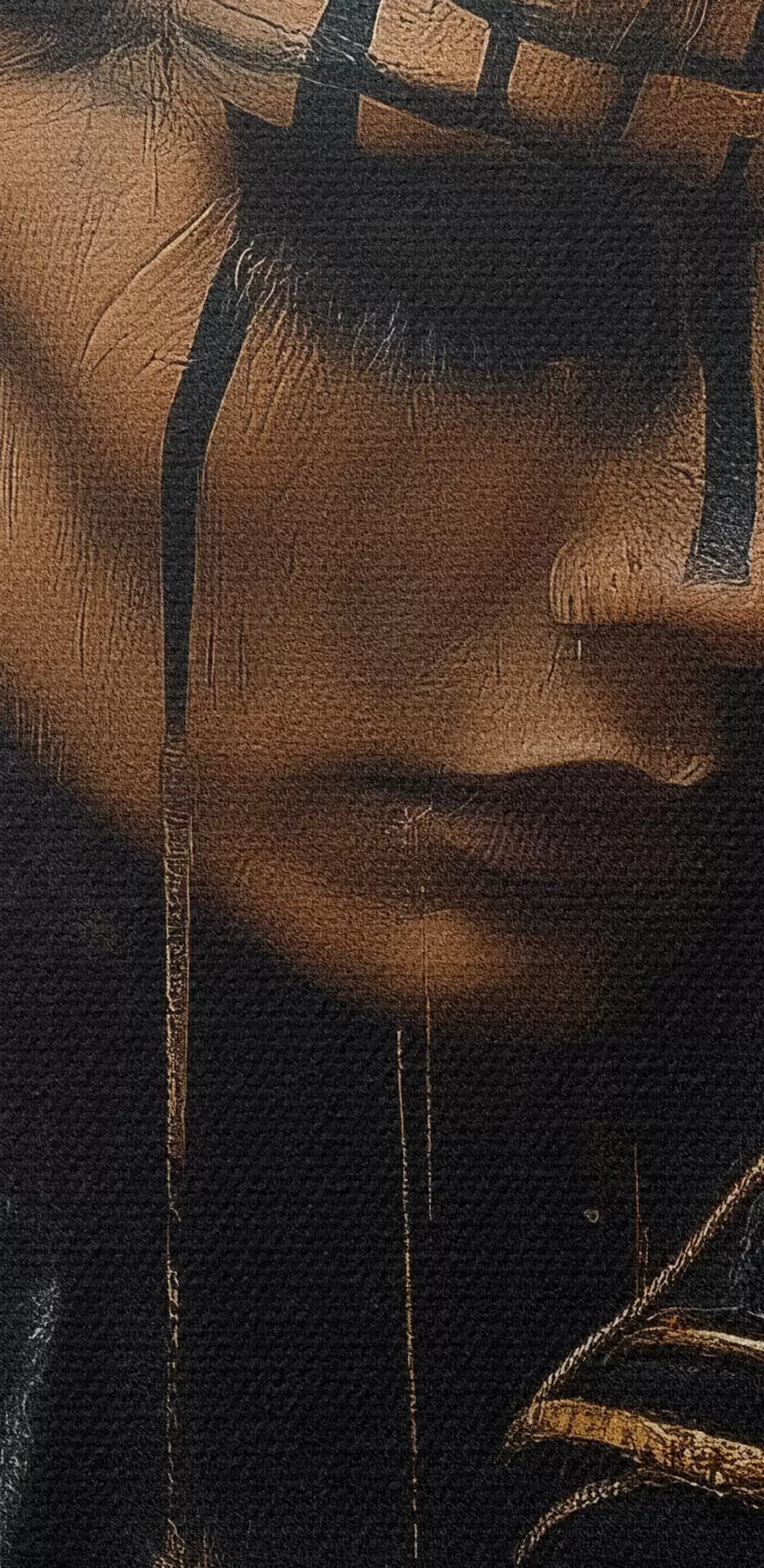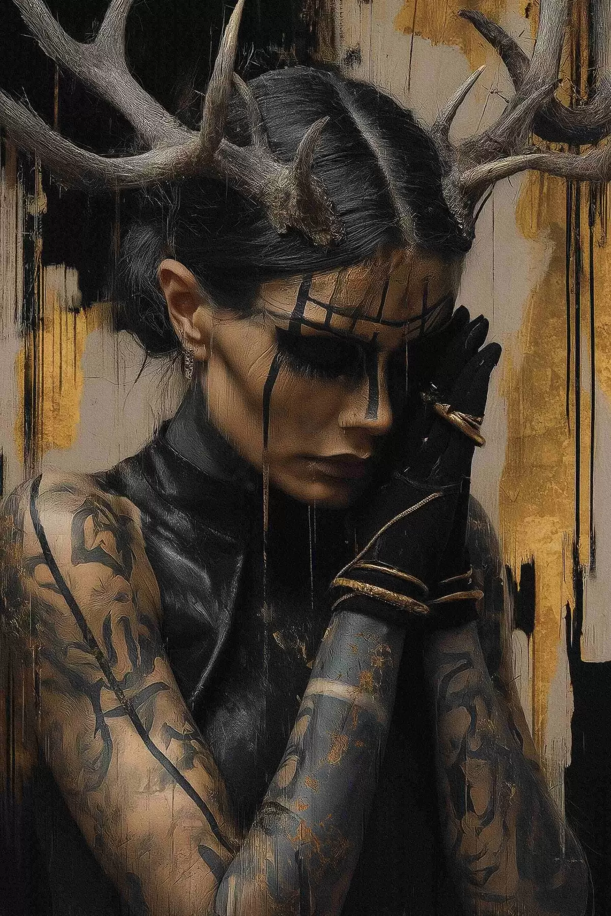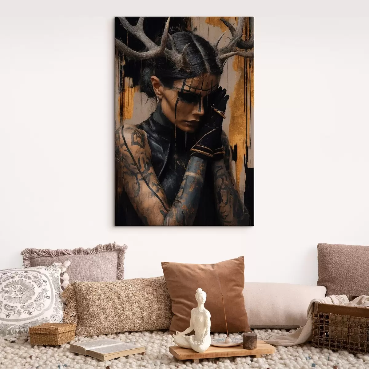 Tableau Femme avec des cornes, au regard sombre et au visage marqué de rides noires Nr s46144