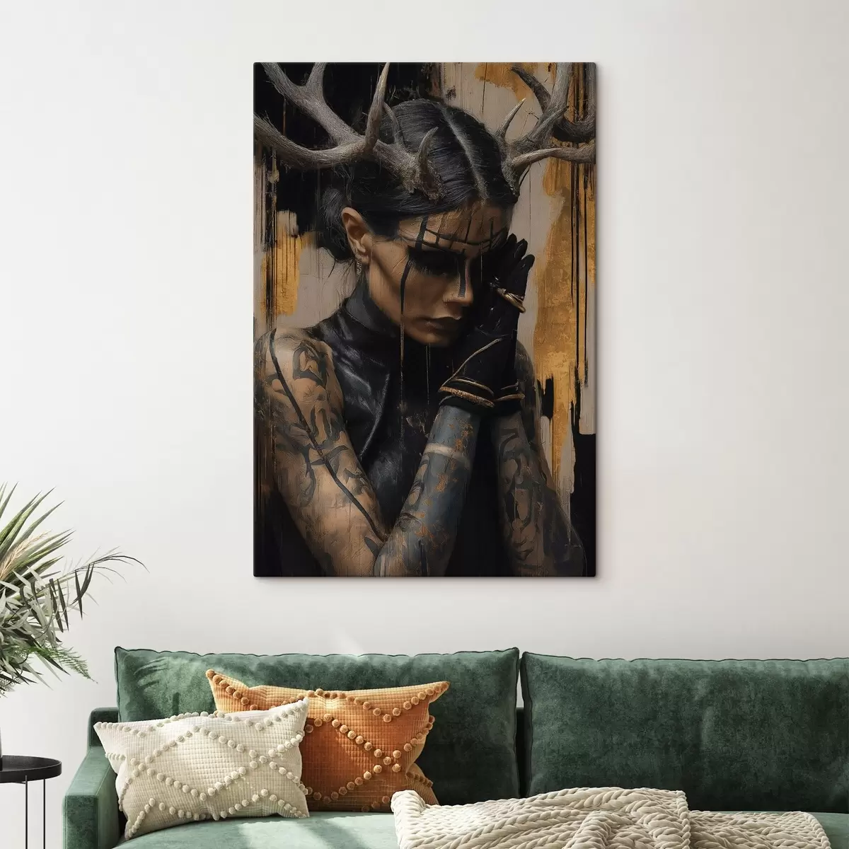 Tableau Femme avec des cornes, au regard sombre et au visage marqué de rides noires Nr s46144