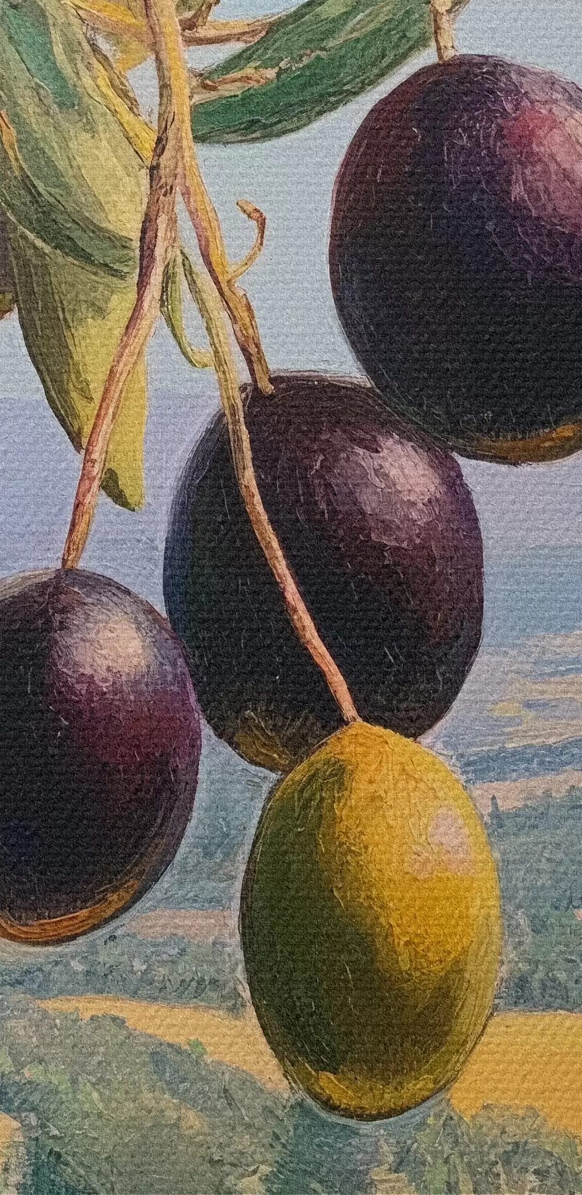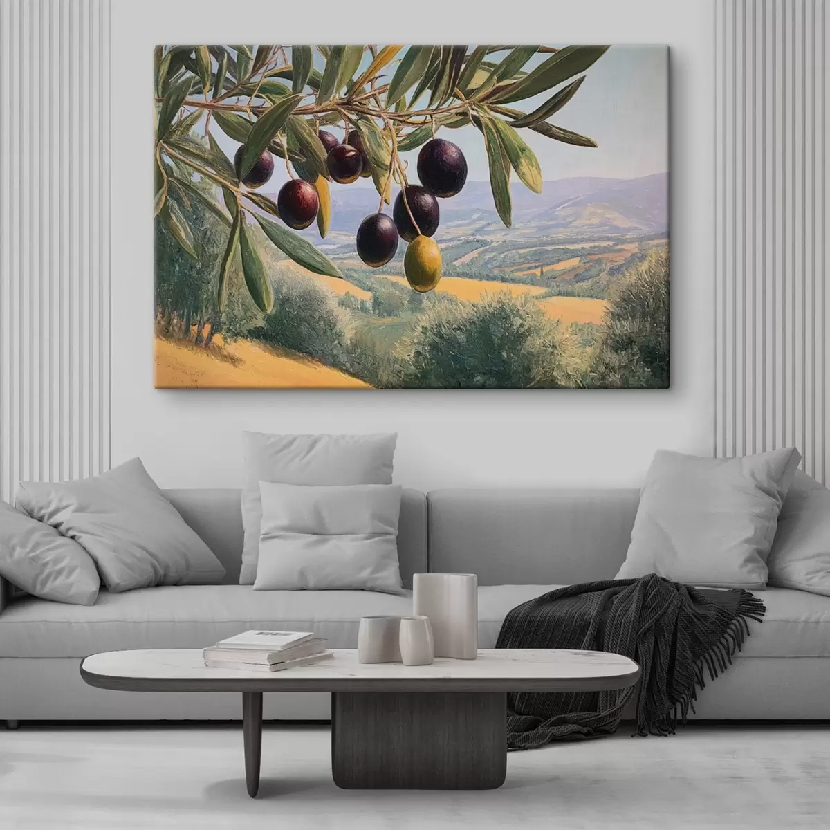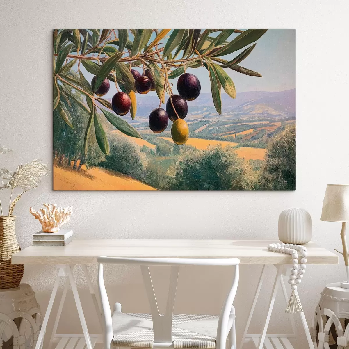 Tableau Branche d'olivier avec des fruits noirs sur fond de paysage estival Nr s46150