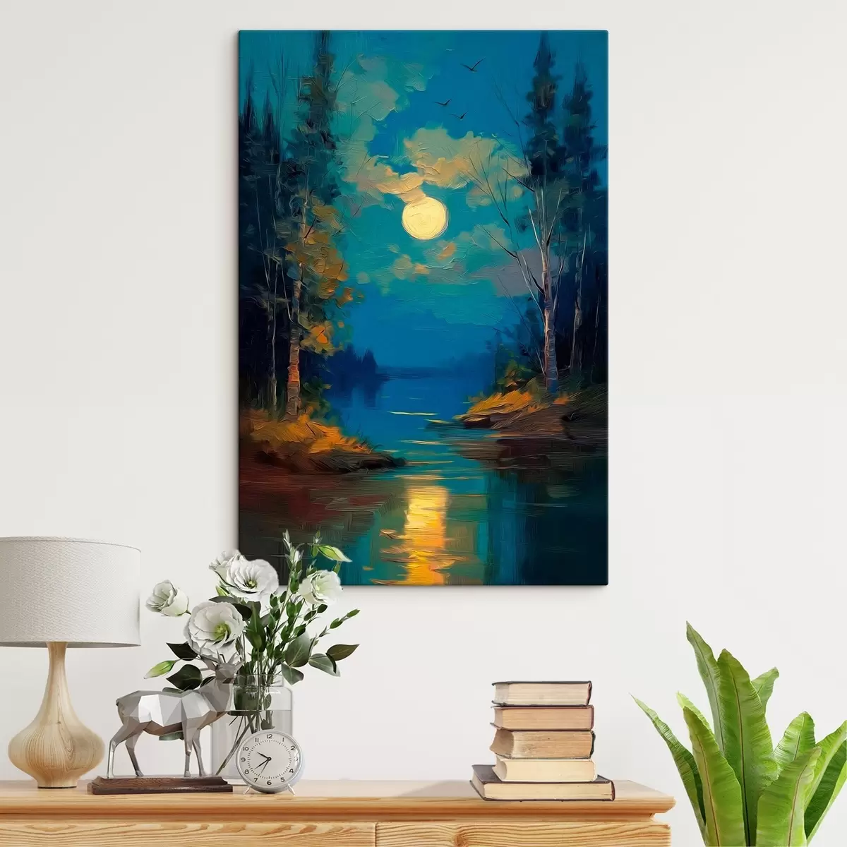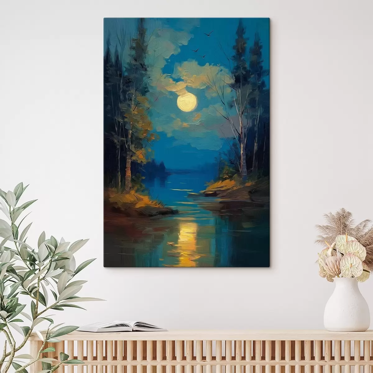 Tableau Clair de lune sur une rivière calme au milieu des pins Nr s46164