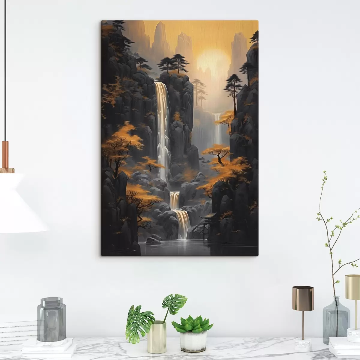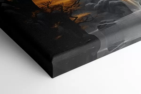 Tableau Paysage rocheux avec une cascade dans les tons chauds du coucher de soleil s46177