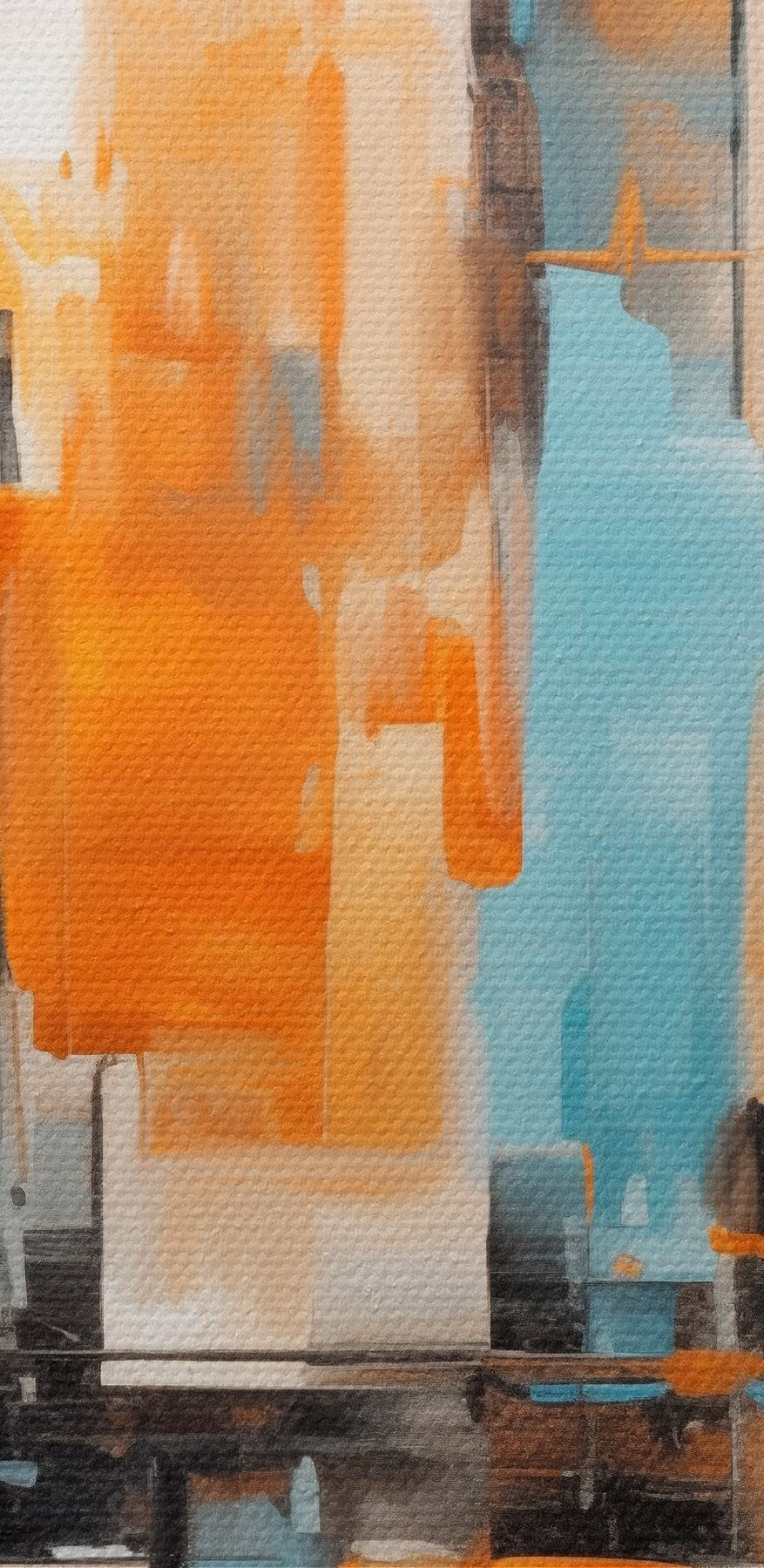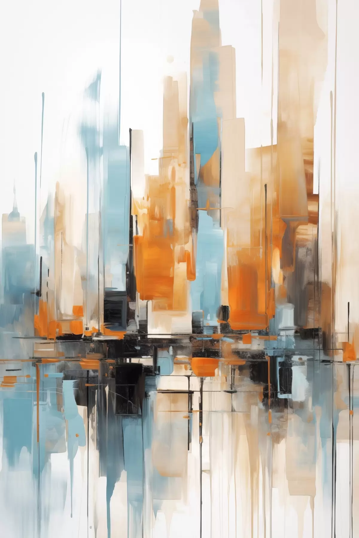 Tableau Paysage urbain abstrait avec des coups de pinceau verticaux dans des tons orange, bleu et blanc, style pictural s46267