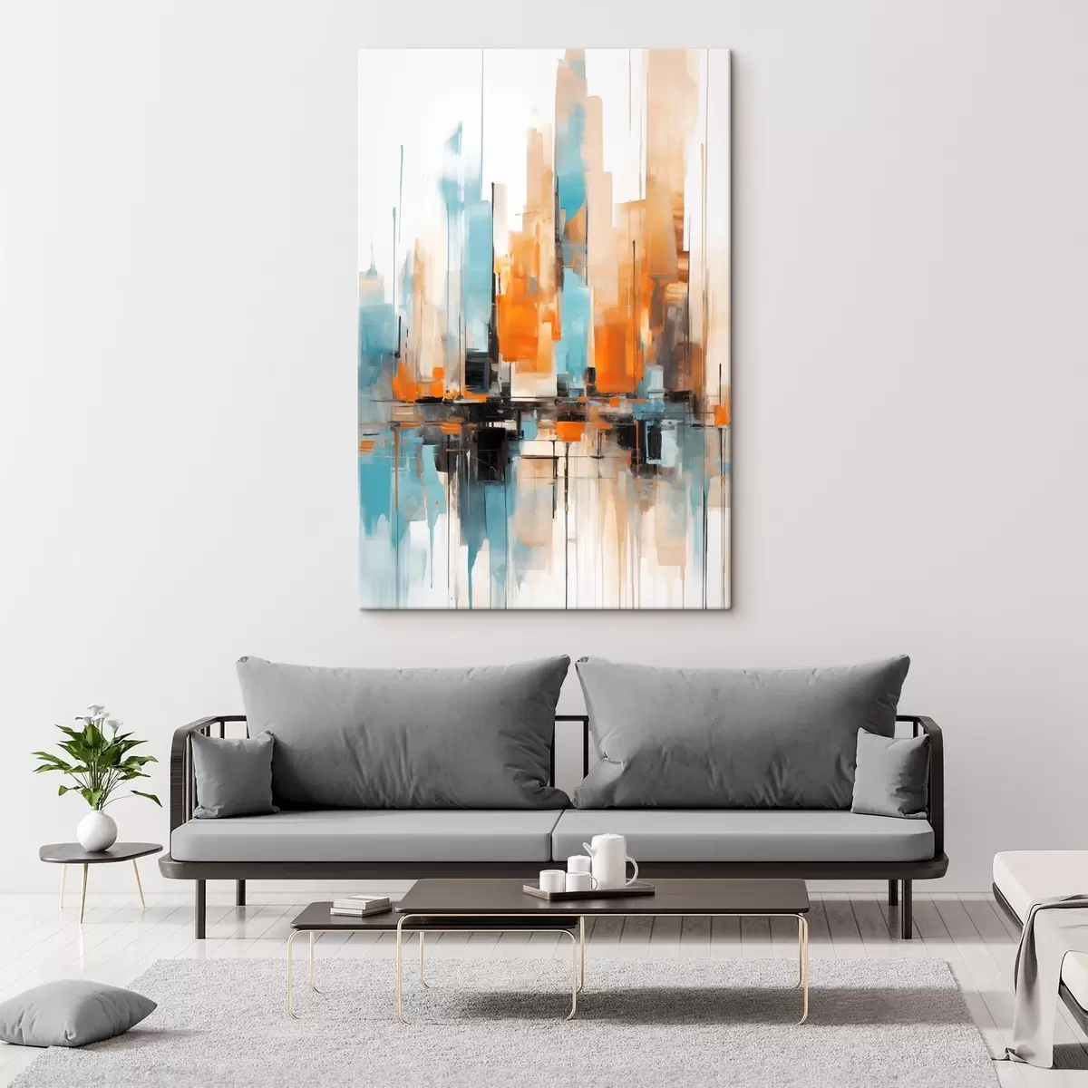 Tableau Paysage urbain abstrait avec des coups de pinceau verticaux dans des tons orange, bleu et blanc, style pictural Nr s46267