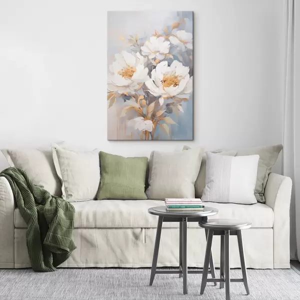 Tableau Pivoines blanches avec centre et feuilles jaunes, coups de pinceau doux, fond bleu clair, composition florale s46270