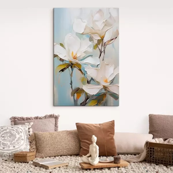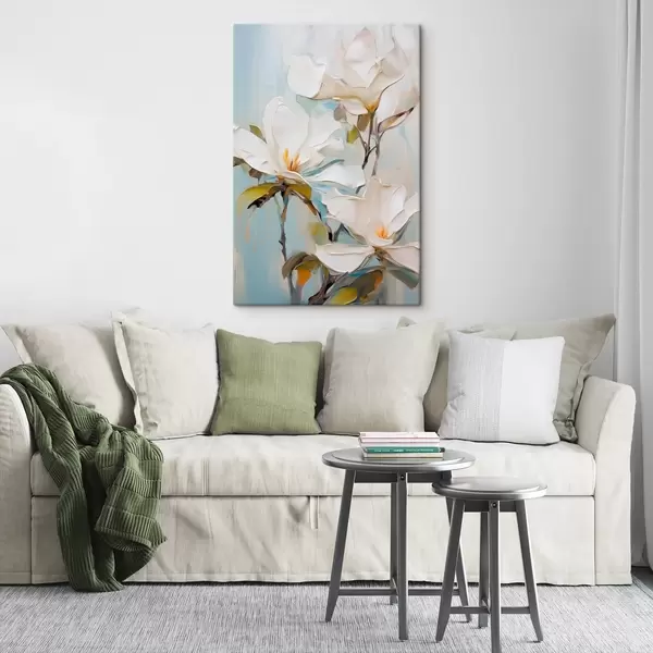 Tableau Fleurs de magnolia blanches, fond bleu clair avec des coups de pinceau doux, style peinture à l'huile, texture impasto s46276