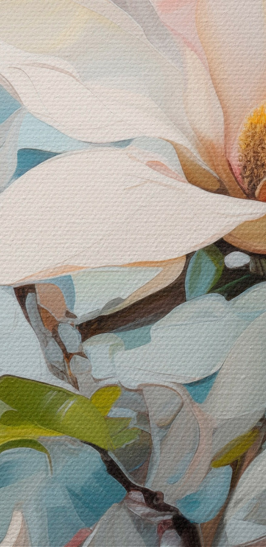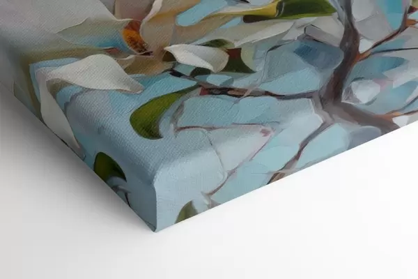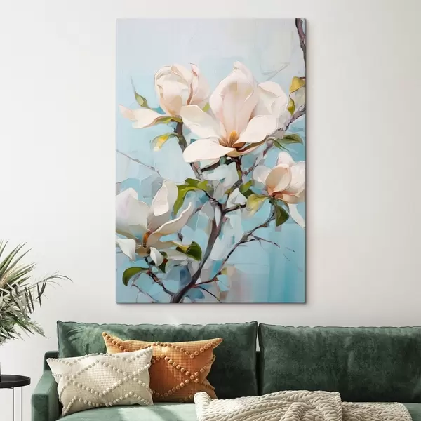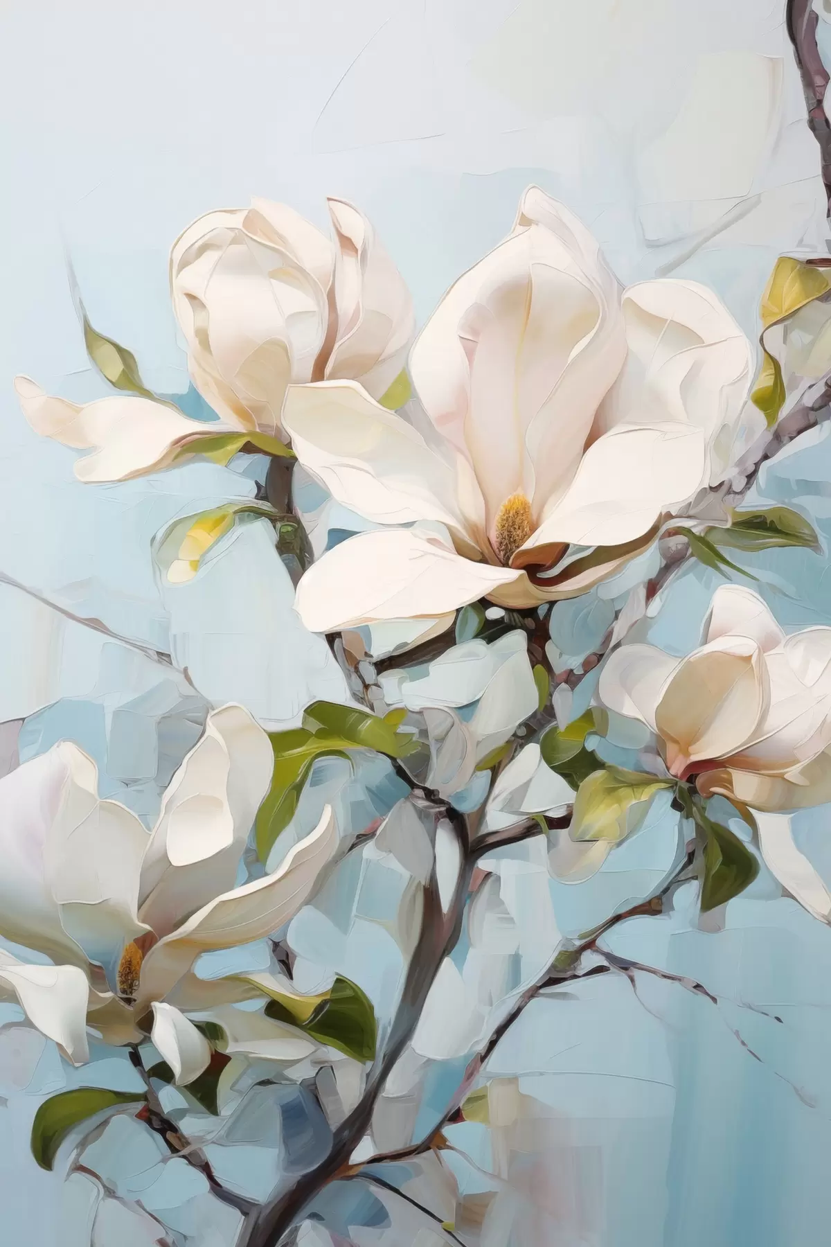 Tableau Fleurs de magnolia blanches, fond bleu clair avec des coups de pinceau doux, style peinture à l'huile, texture impasto s46277