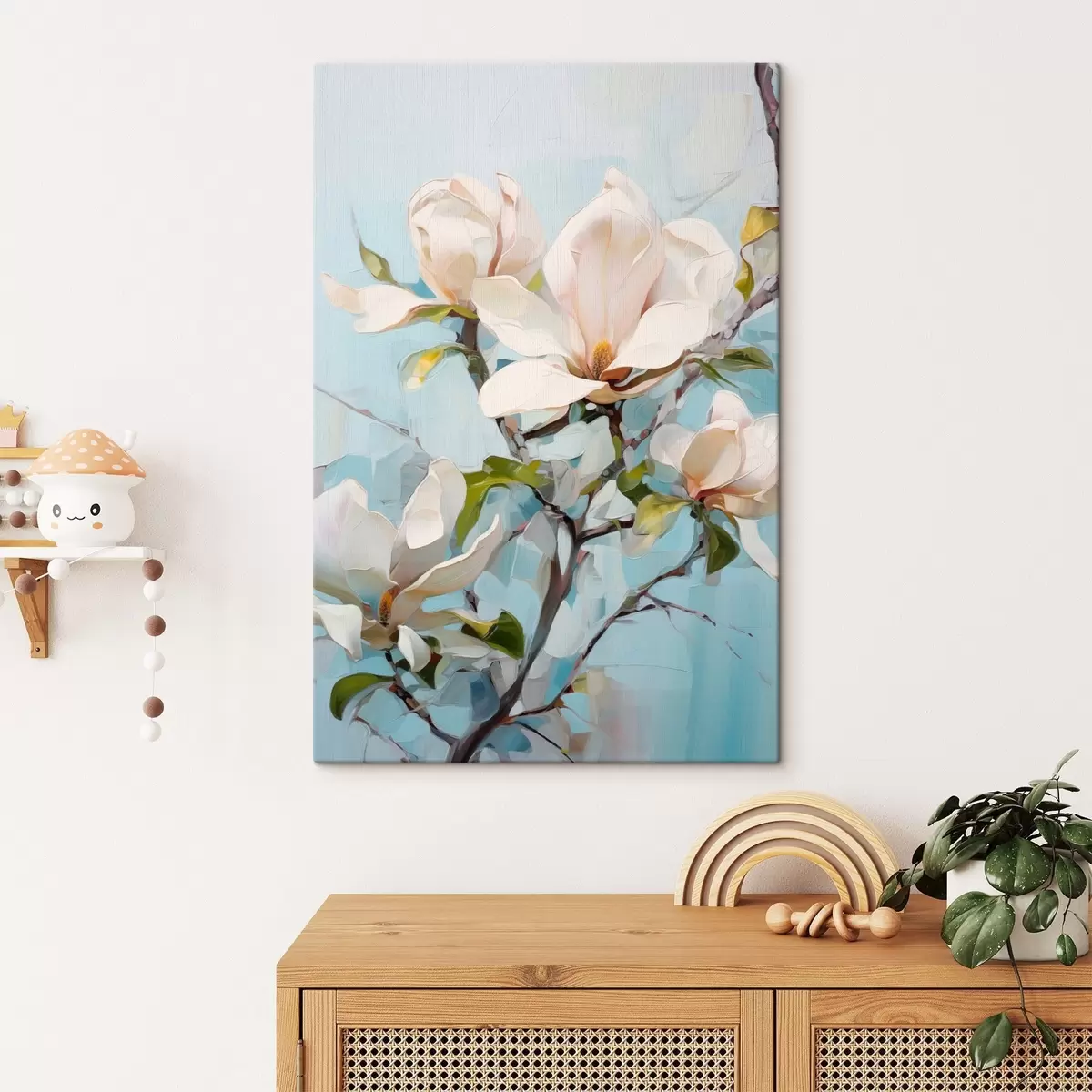 Tableau Fleurs de magnolia blanches, fond bleu clair avec des coups de pinceau doux, style peinture à l'huile, texture impasto s46277