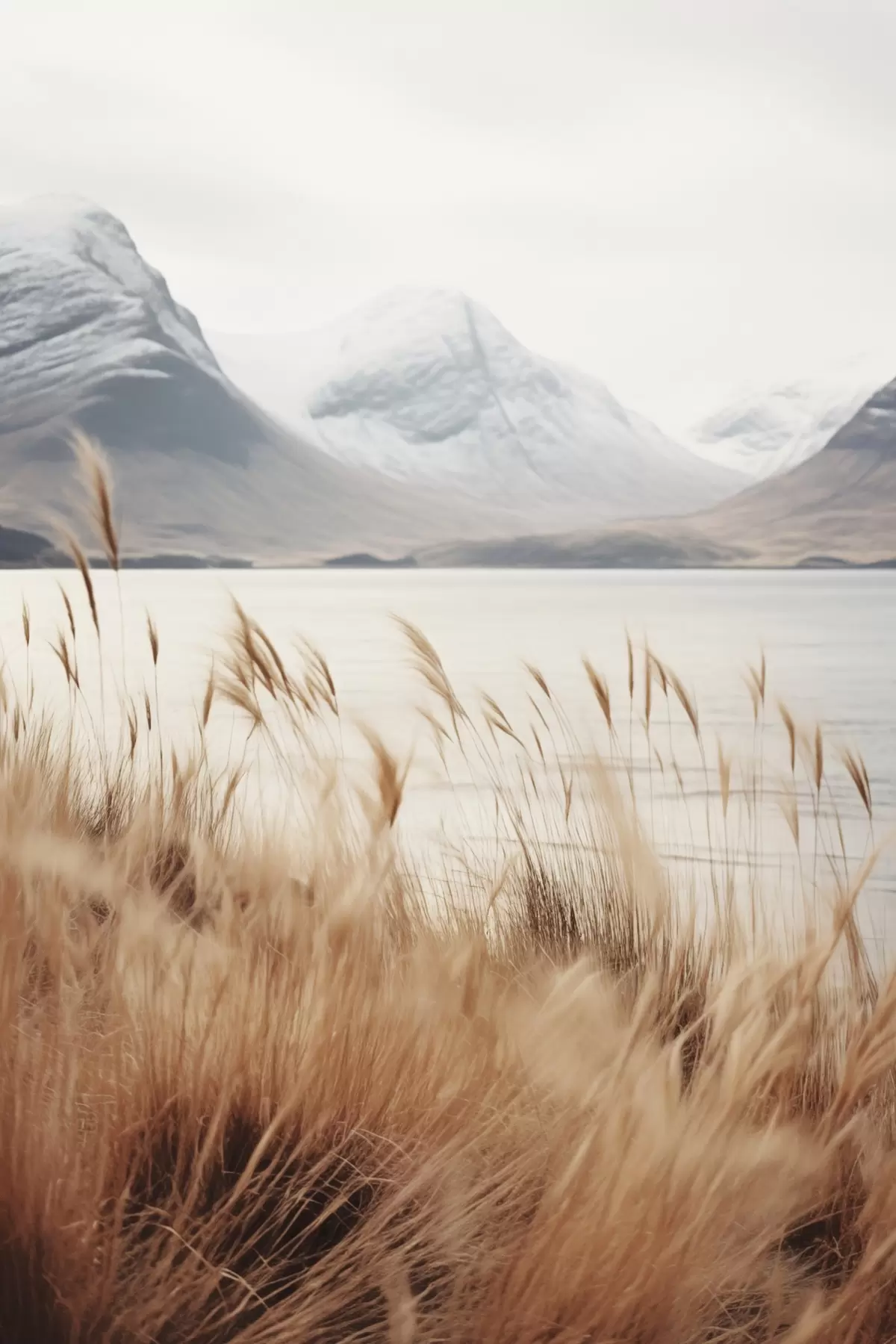 Tableau Champ d'herbes de la pampa devant un paysage lacustre avec des montagnes enneigées en arrière-plan, lumière douce s46282