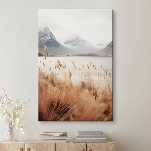 Tableau Champ d'herbes de la pampa devant un paysage lacustre avec des montagnes enneigées en arrière-plan, lumière douce Nr s46282