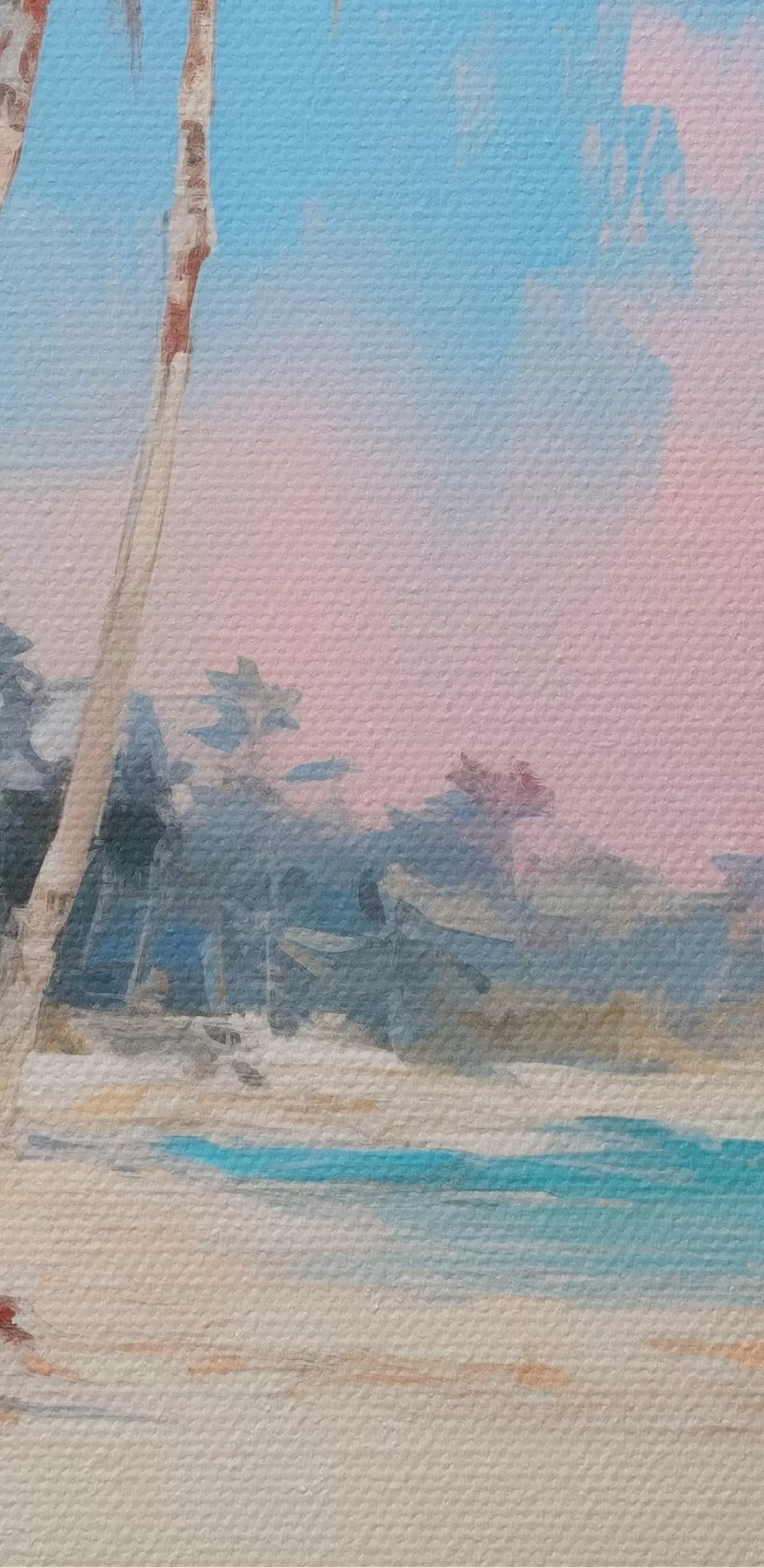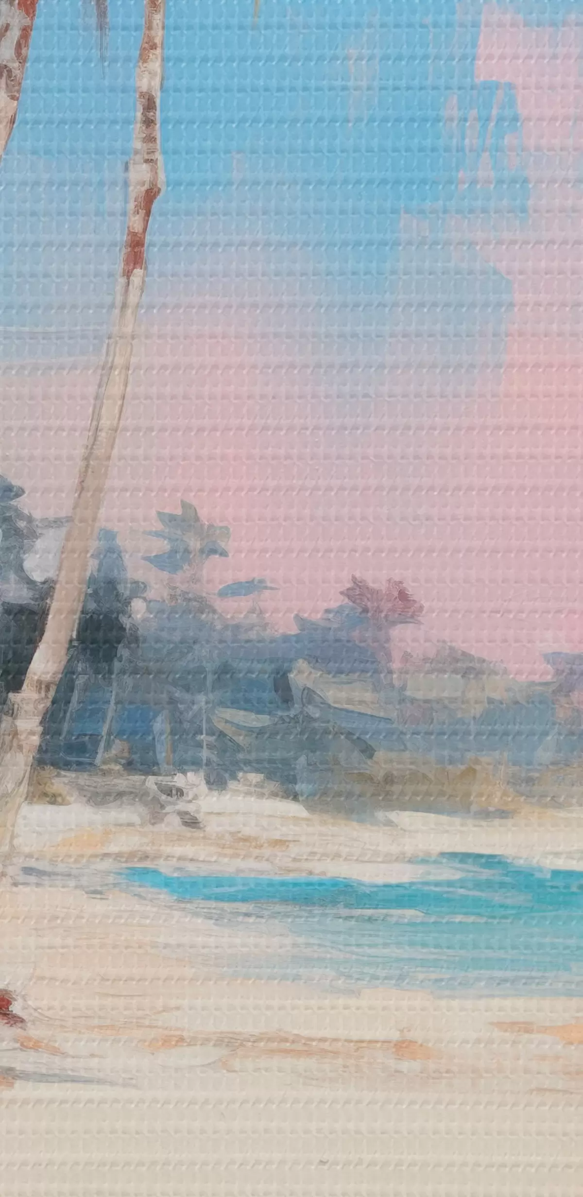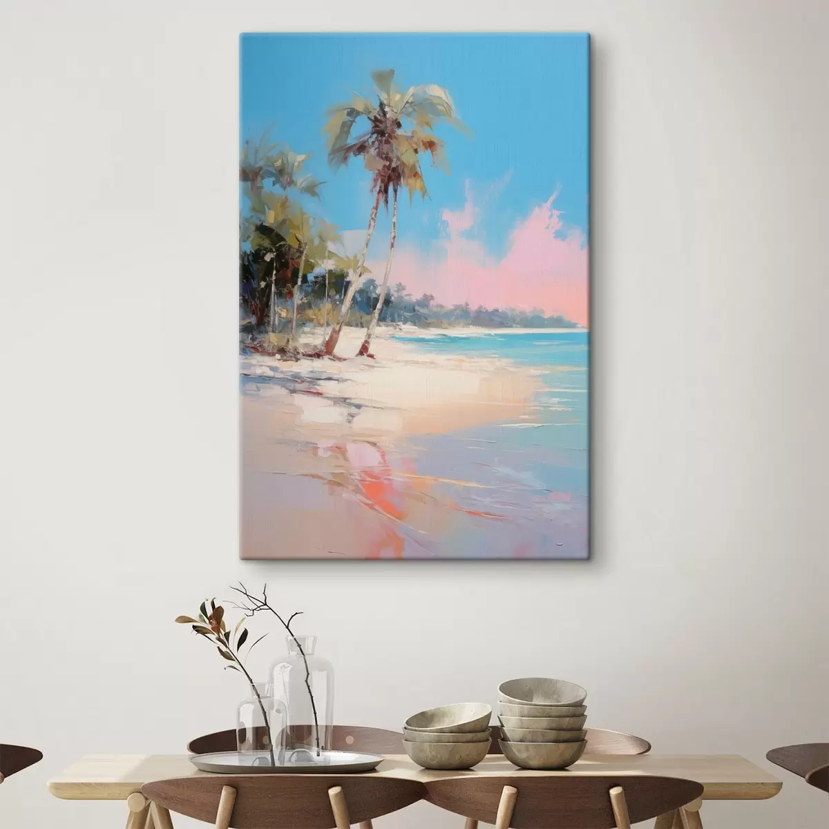Tableau Plage tropicale abstraite avec sable blanc et palmiers, ciel bleu avec nuages blancs Nr s46285