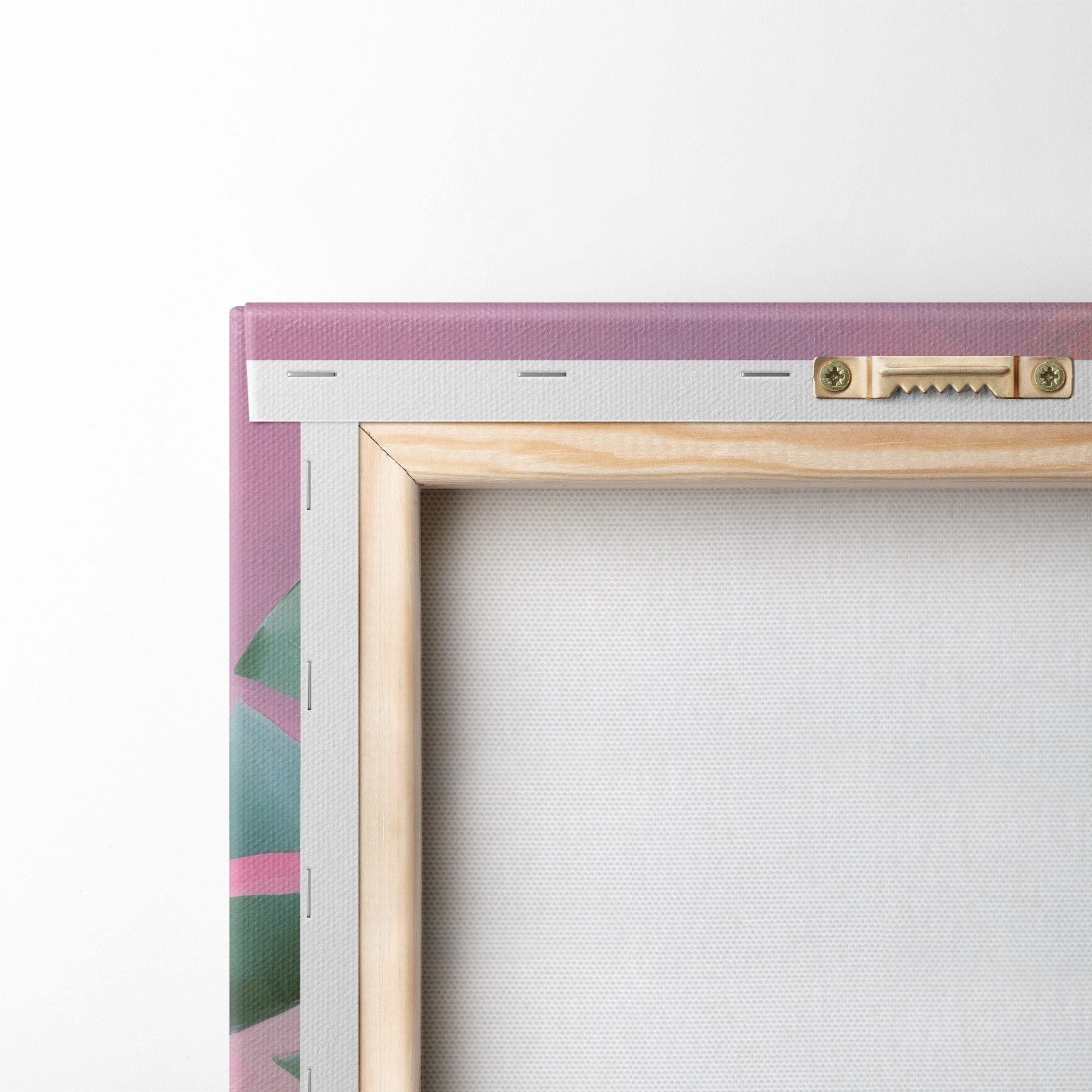 Tableau Plante abstraite monstera aux feuilles d'un vert éclatant, sur fond de douces teintes roses et violettes s46286