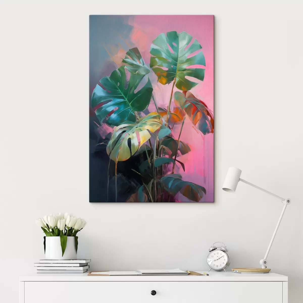 Tableau Plante abstraite monstera aux feuilles d'un vert éclatant, sur fond de douces teintes roses et violettes Nr s46286