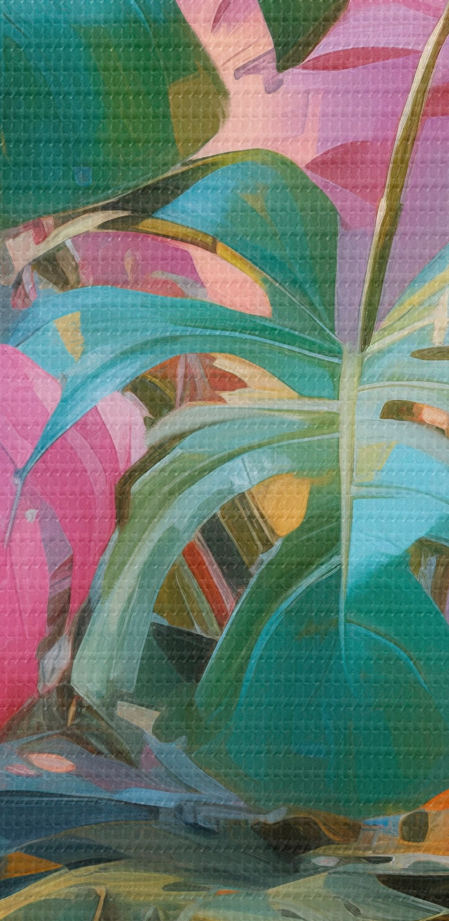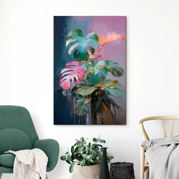 Tableau Plante abstraite monstera aux feuilles roses et vertes, aux couleurs vives, sur fond flou Nr s46287