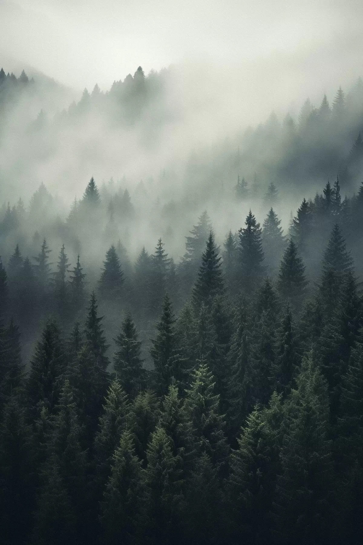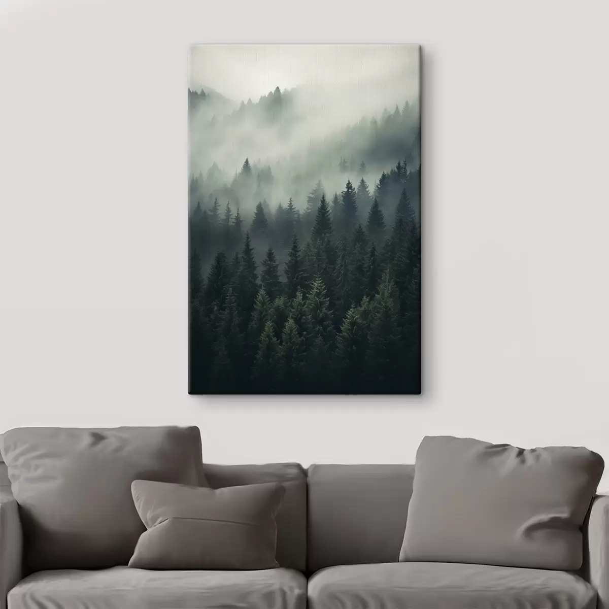 Tableau Brouillard roulant sur une forêt dense à feuilles persistantes Nr s46512