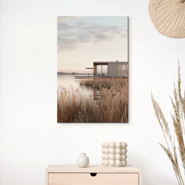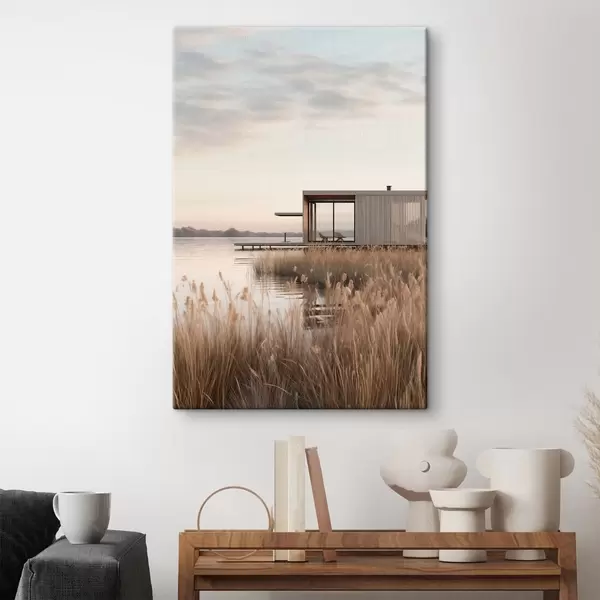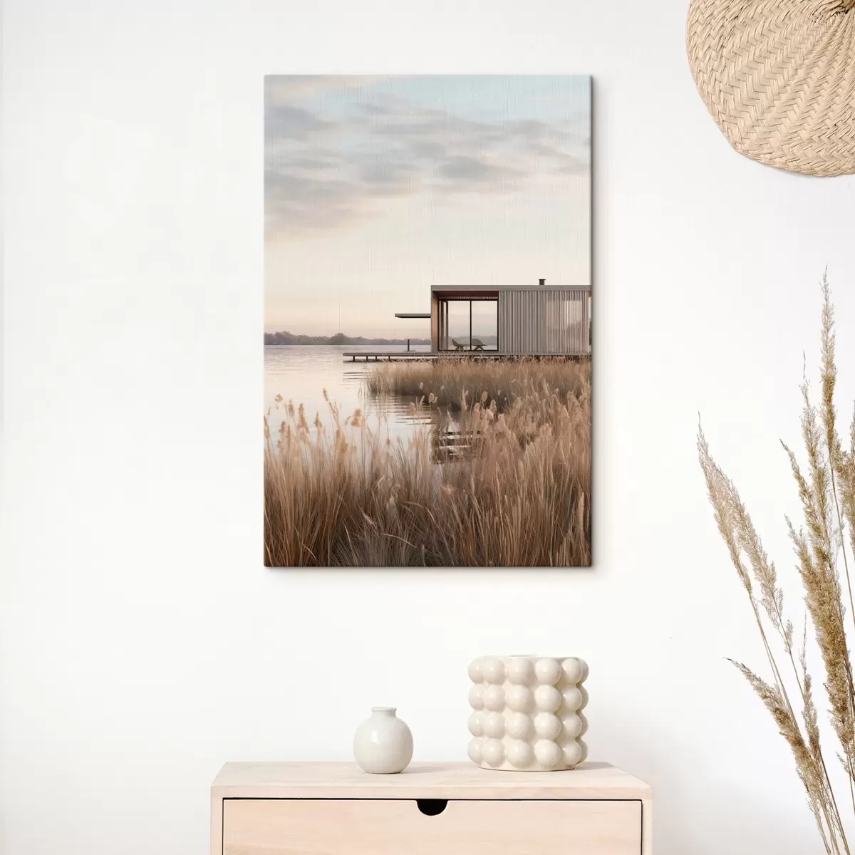Tableau Cabane moderne au bord d'un lac, parmi les roseaux, au crépuscule s46513