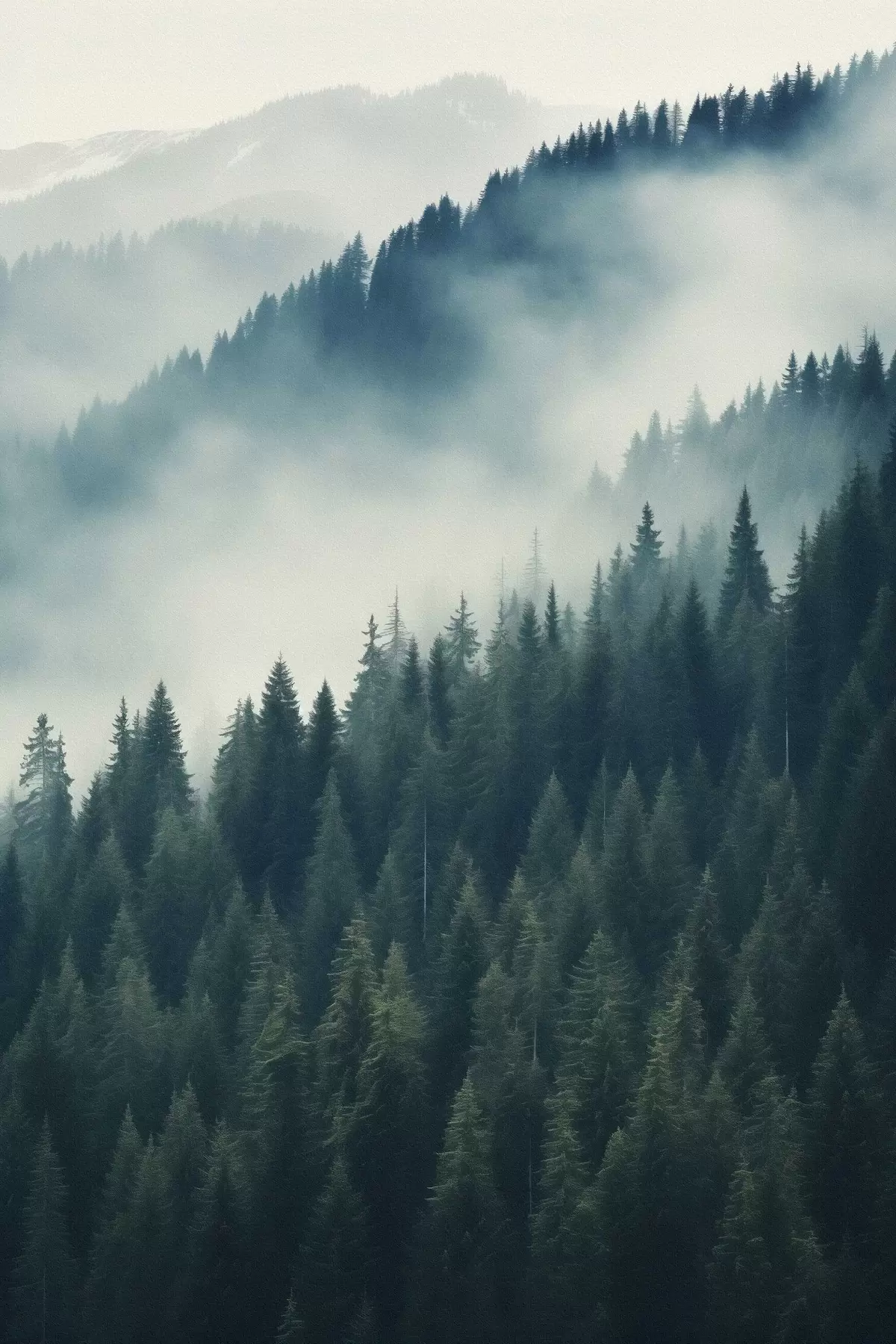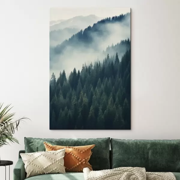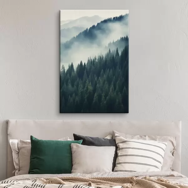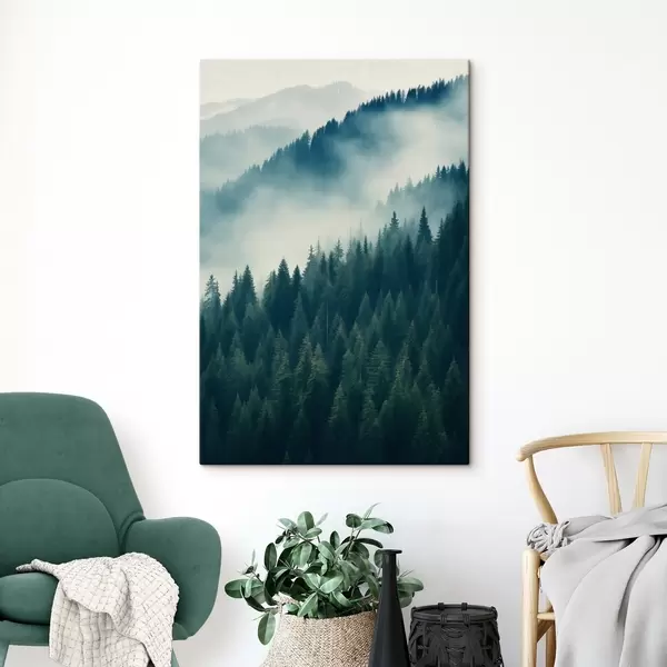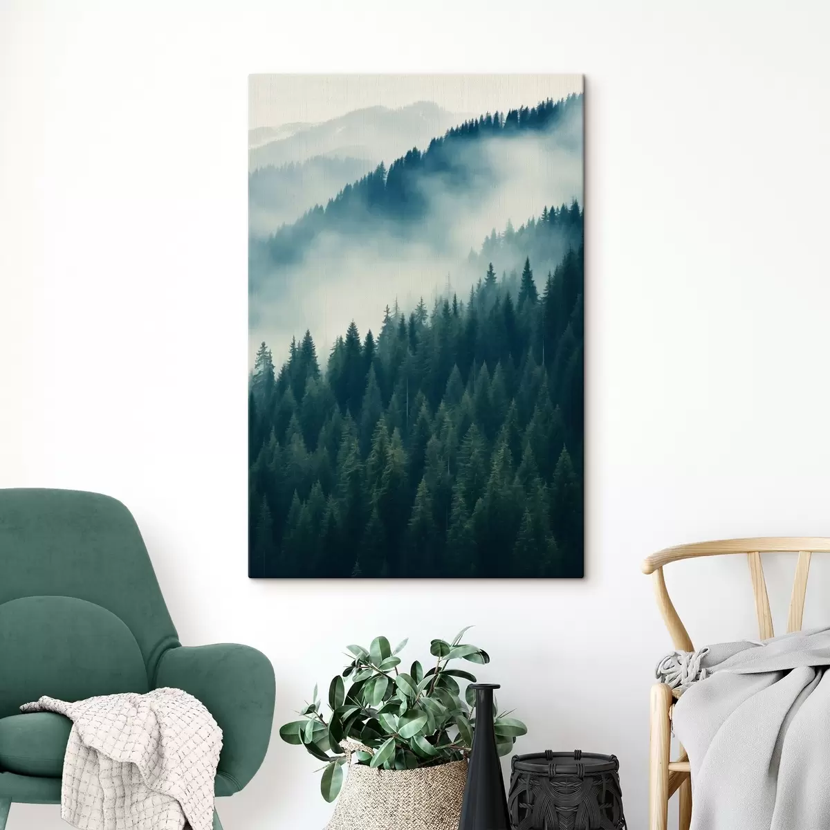 Tableau Brouillard sur les pentes couvertes de conifères, tons vert foncé s46516