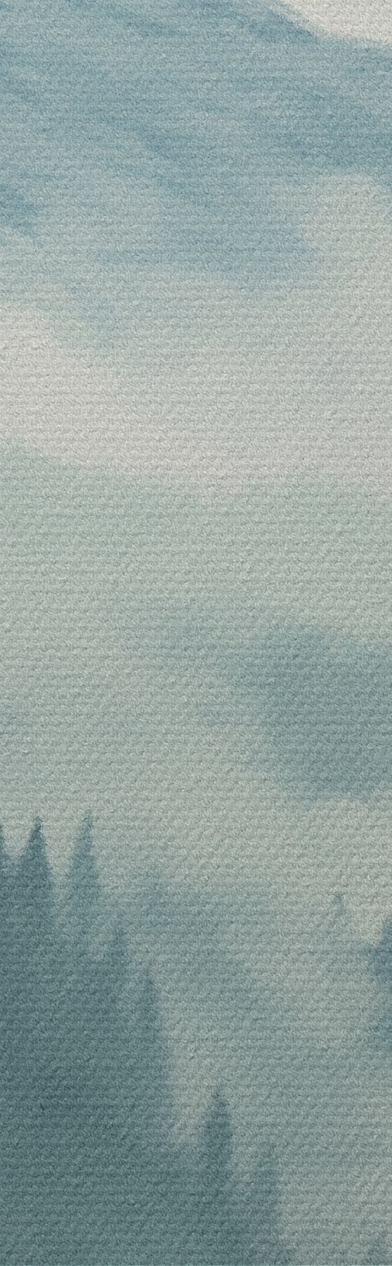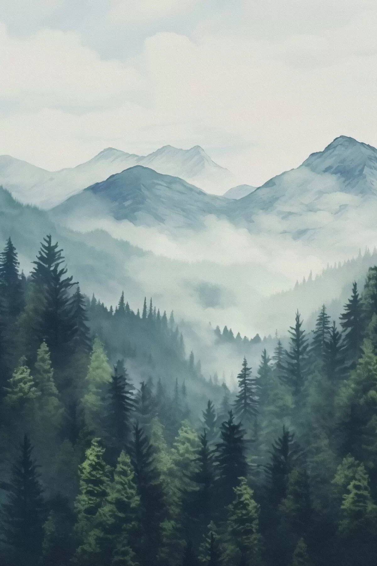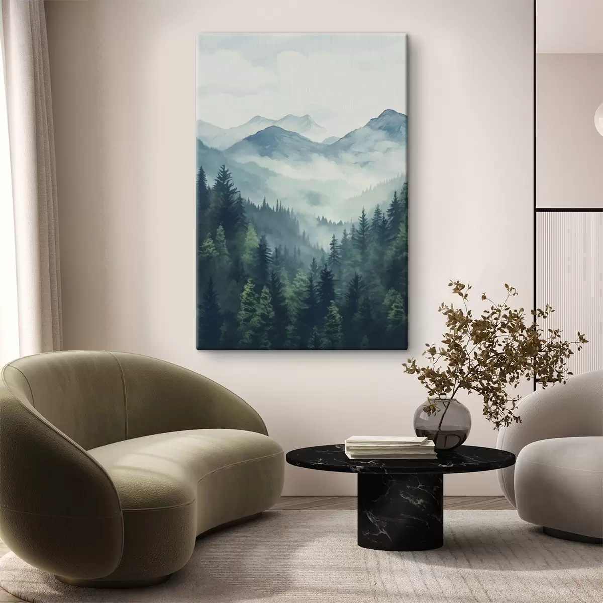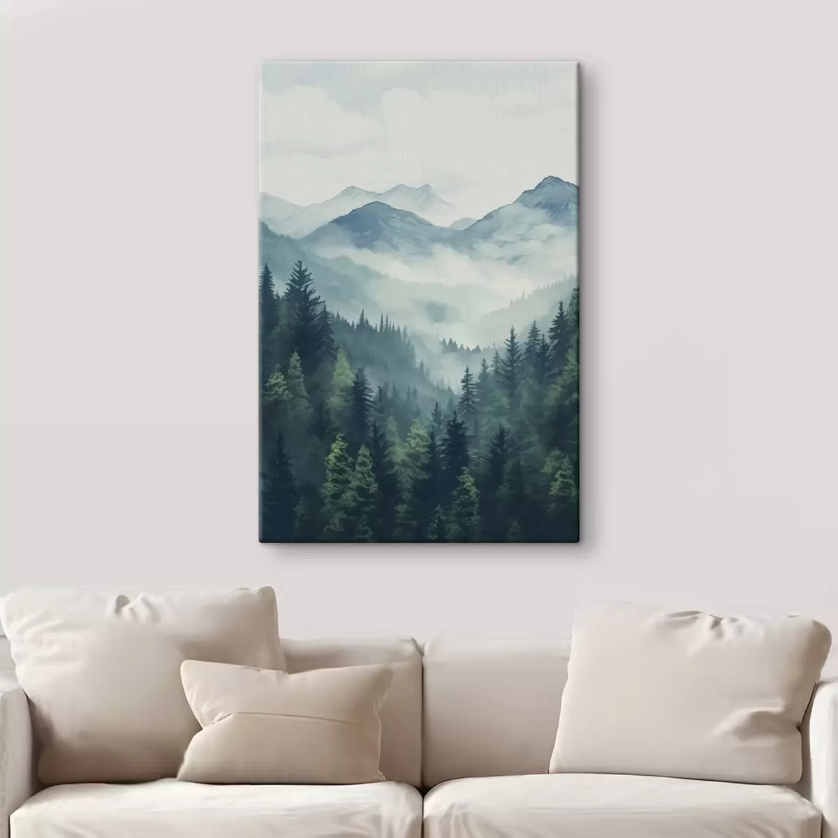 Tableau Montagnes et forêt aquarellées dans la douce brume matinale s46519
