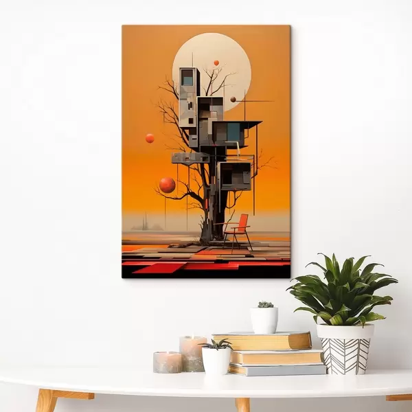 Tableau Cabane surréaliste dans les arbres sur fond orange Nr s46526