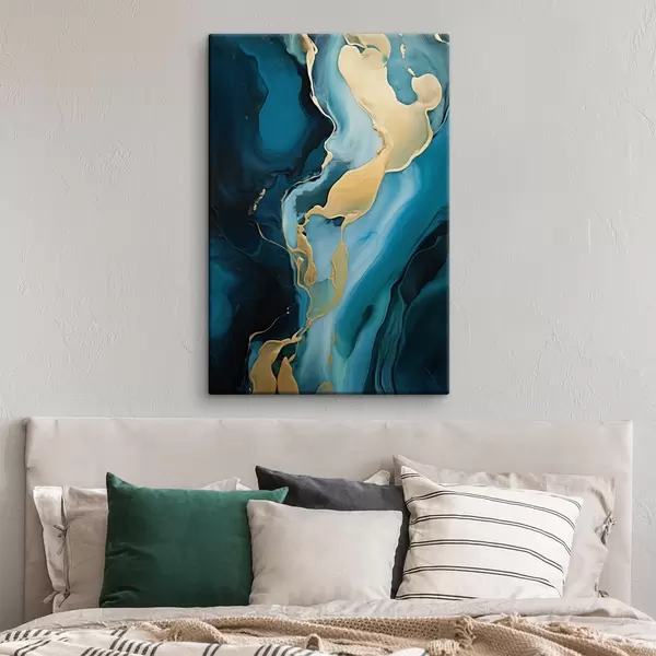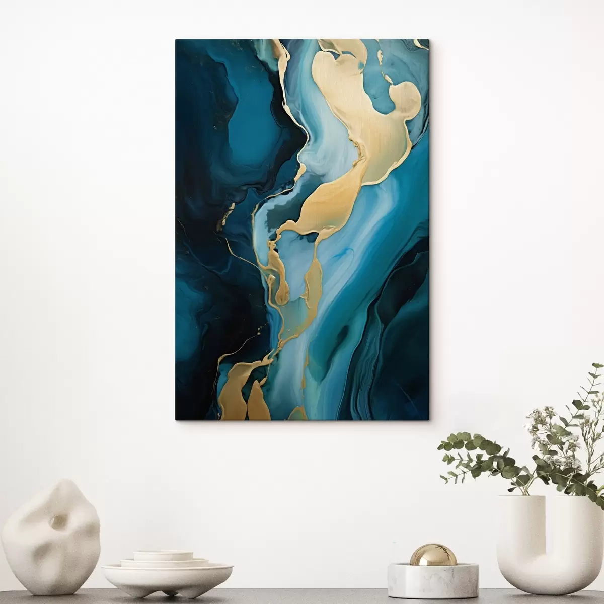 Tableau Abstrait bleu sarcelle avec un trait ocre Nr s46530