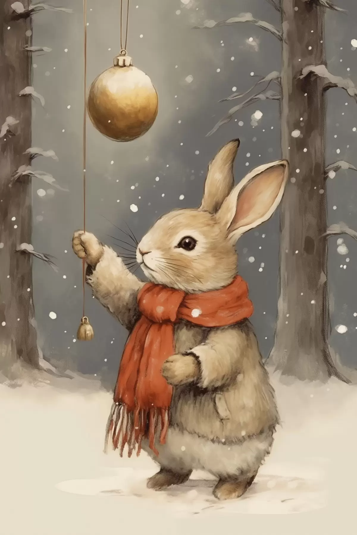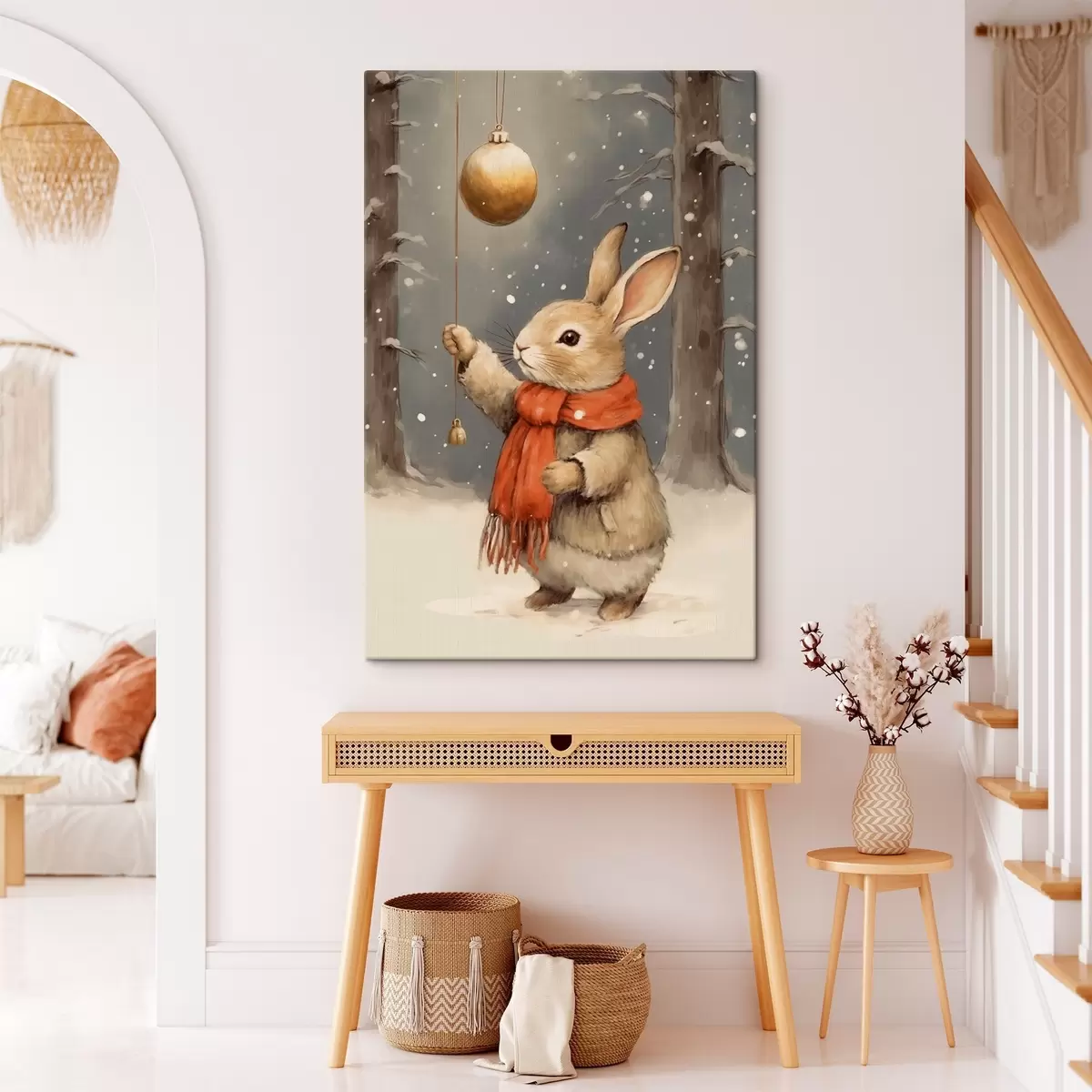 Tableau Lièvre d'hiver avec écharpe et boule de Noël s46619
