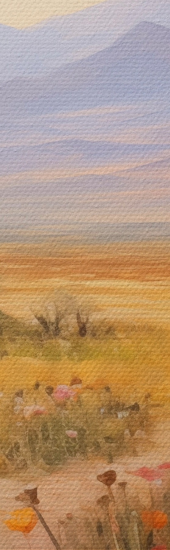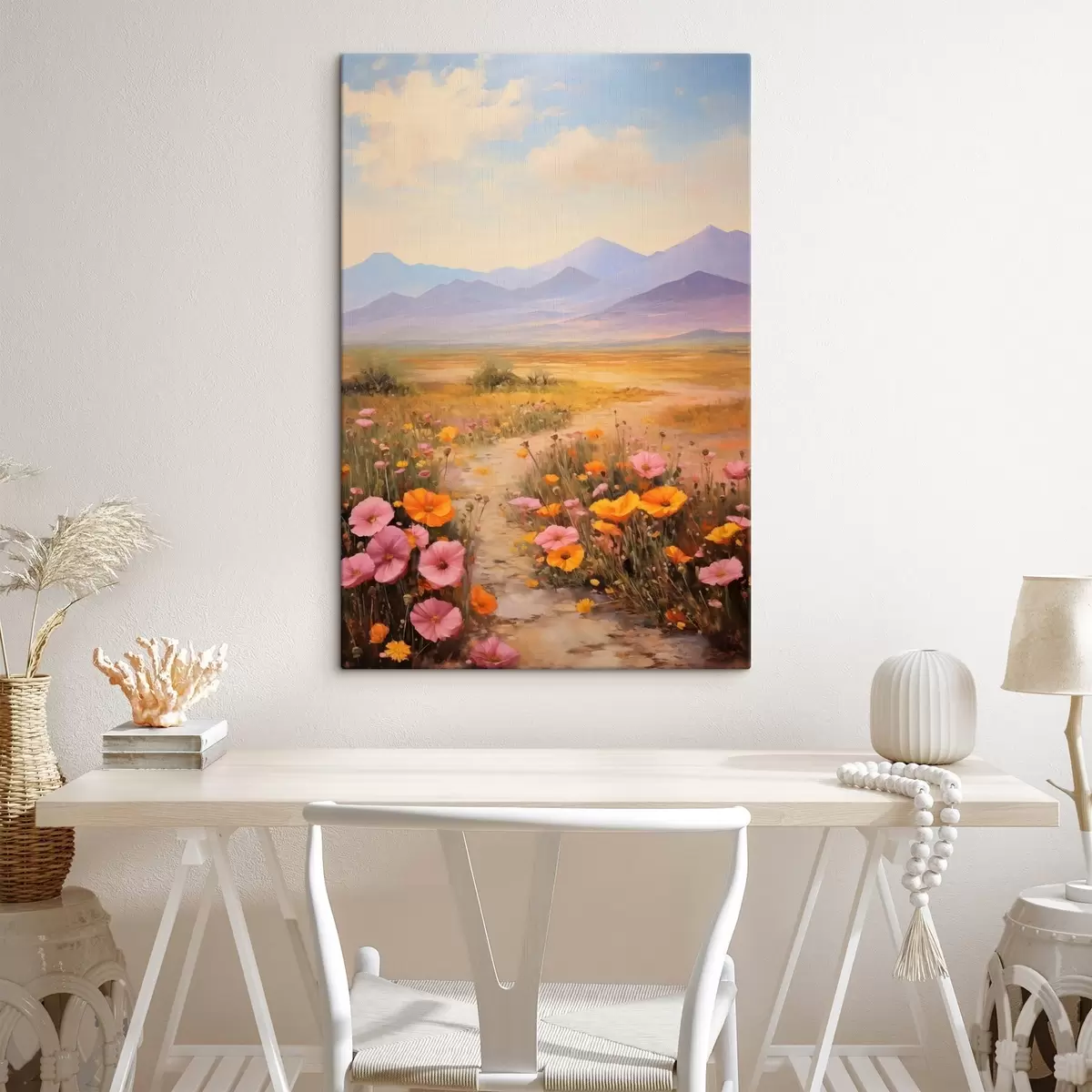 Tableau Paysage, champ de fleurs colorées avec des montagnes en arrière-plan, couleurs douces et pastel s46686