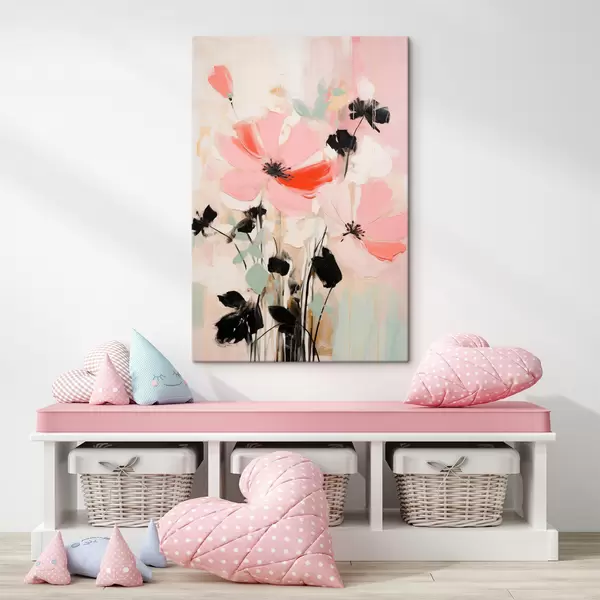 Tableau Fleurs roses et noires avec des feuilles, couleurs pastel douces, composition florale abstraite, art minimaliste Nr s46687