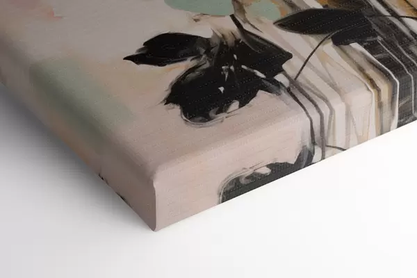 Tableau Fleurs roses et noires avec des feuilles, couleurs pastel douces, composition florale abstraite, art minimaliste s46687