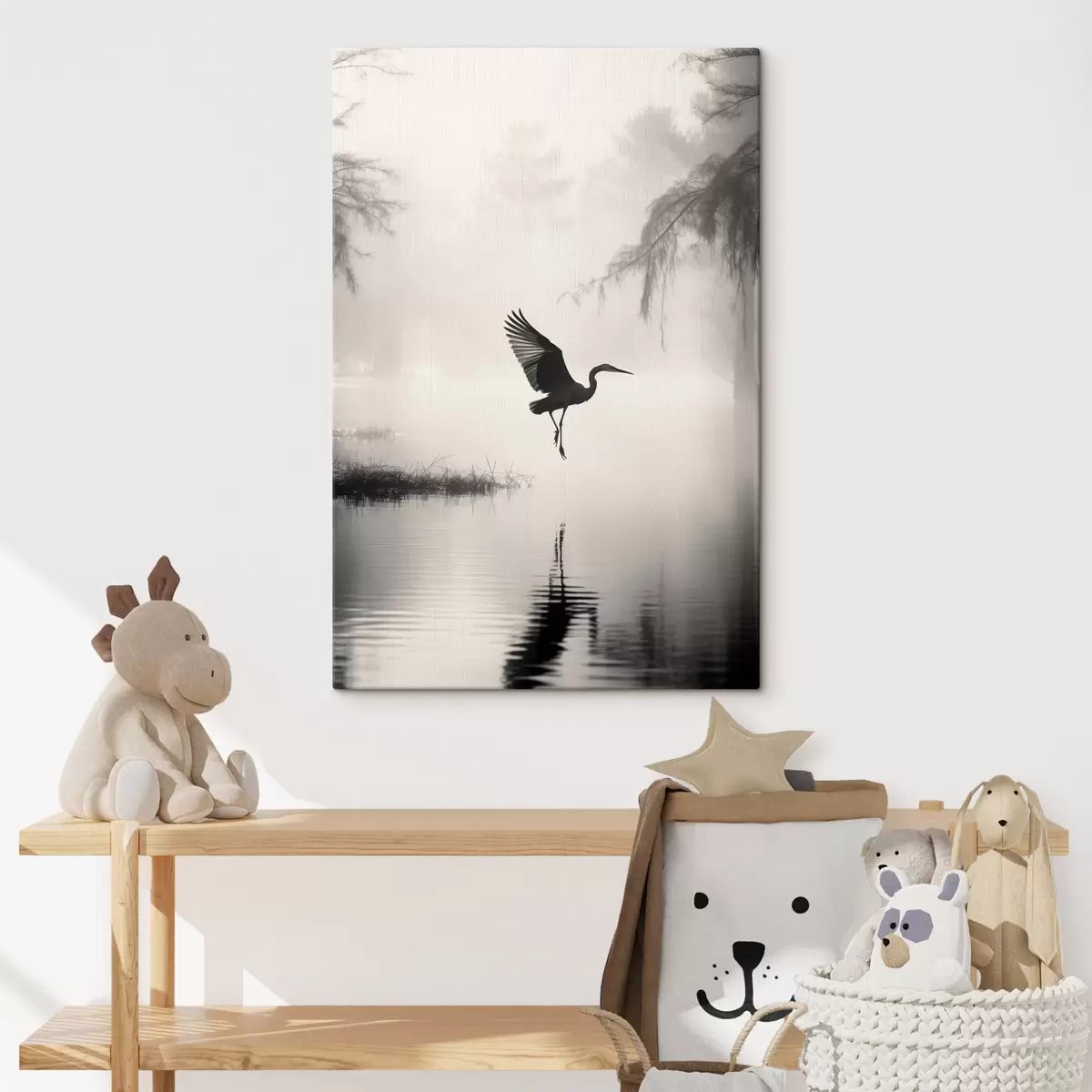 Tableau Un héron blanc aux ailes déployées, volant près de grands roseaux, composition minimaliste en noir et blanc s46694
