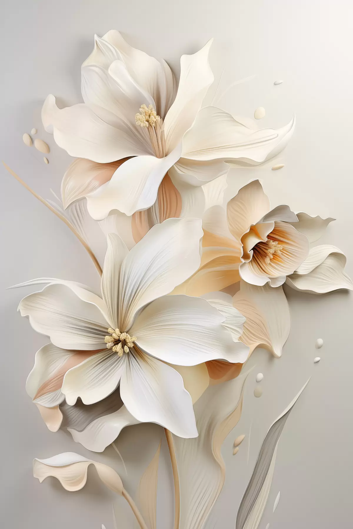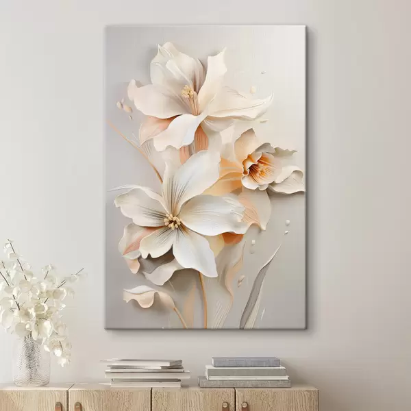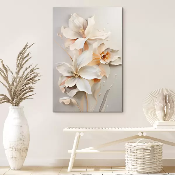 Tableau Fleurs blanches, pétales aux ombres douces, fond beige clair, composition élégante, style minimaliste Nr s46699