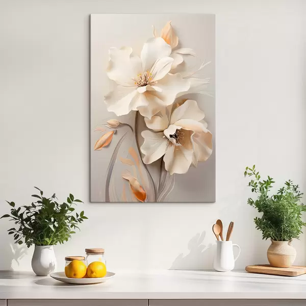 Tableau Fleurs blanches, pétales aux ombres douces, fond beige clair, composition élégante, style minimaliste s46700