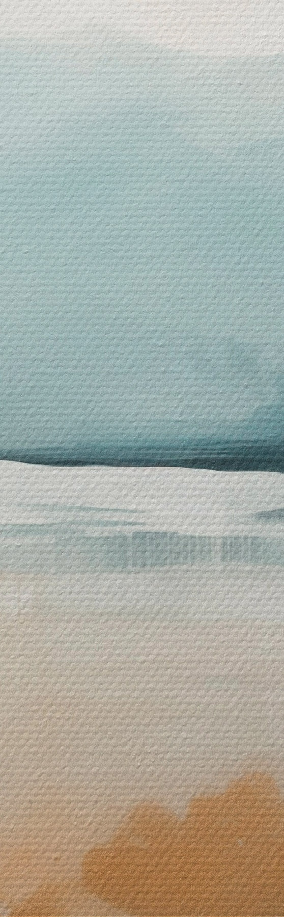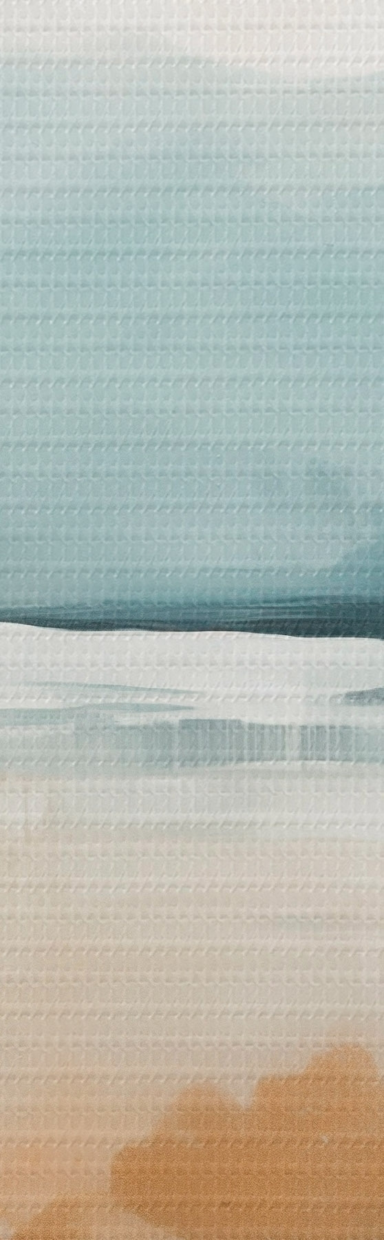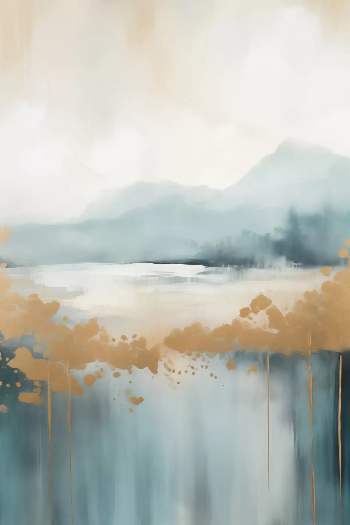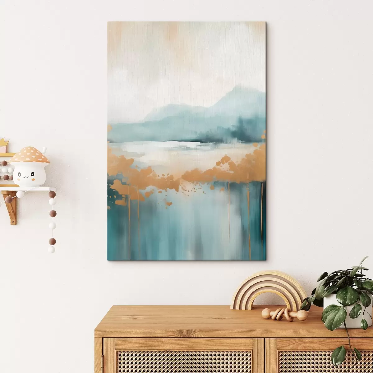 Tableau Paysage abstrait avec montagnes et lac dans des tons bleu sarcelle et jaune texturé, coups de pinceau doux, œuvre minimaliste s46703