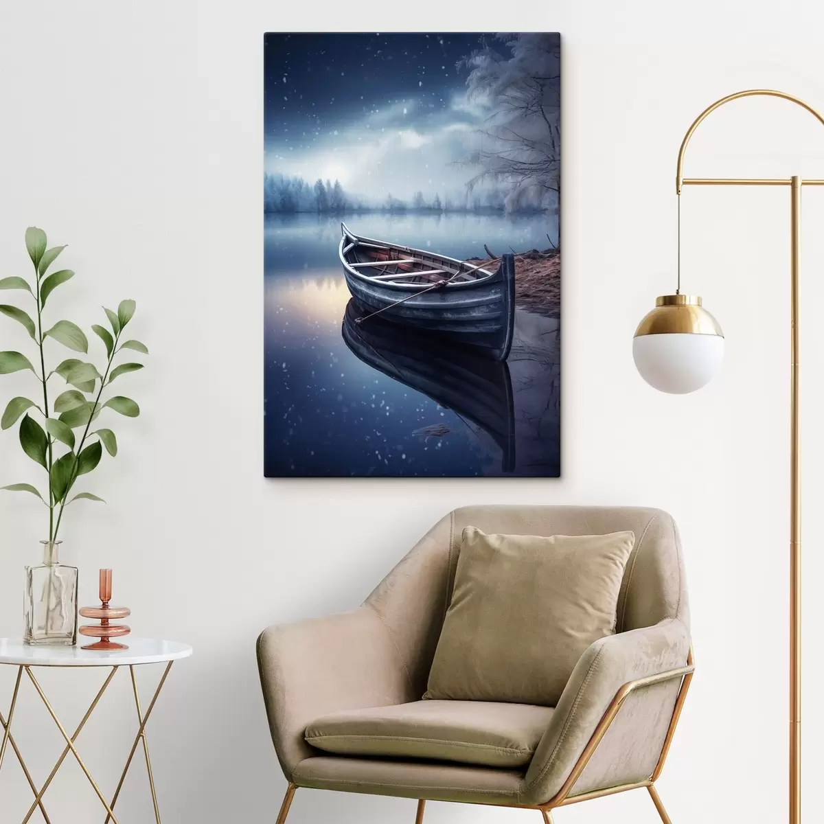 Tableau Bateau vide au bord d'un lac en hiver s46773