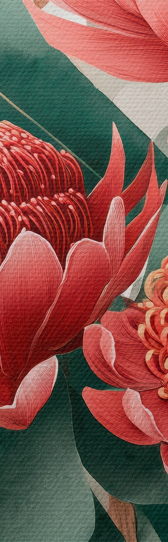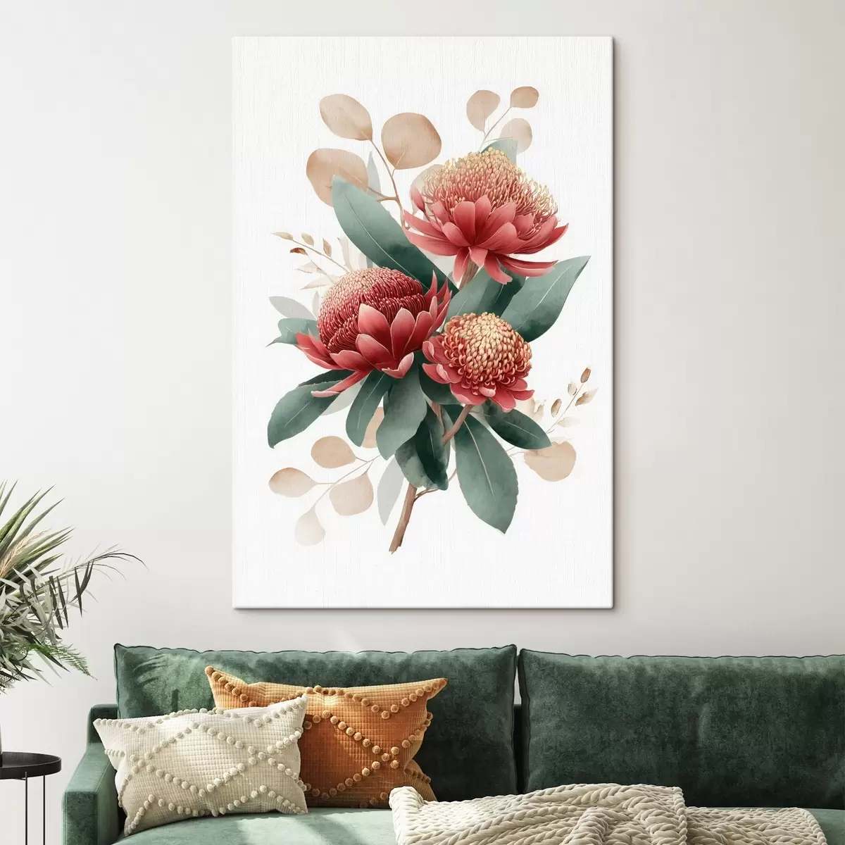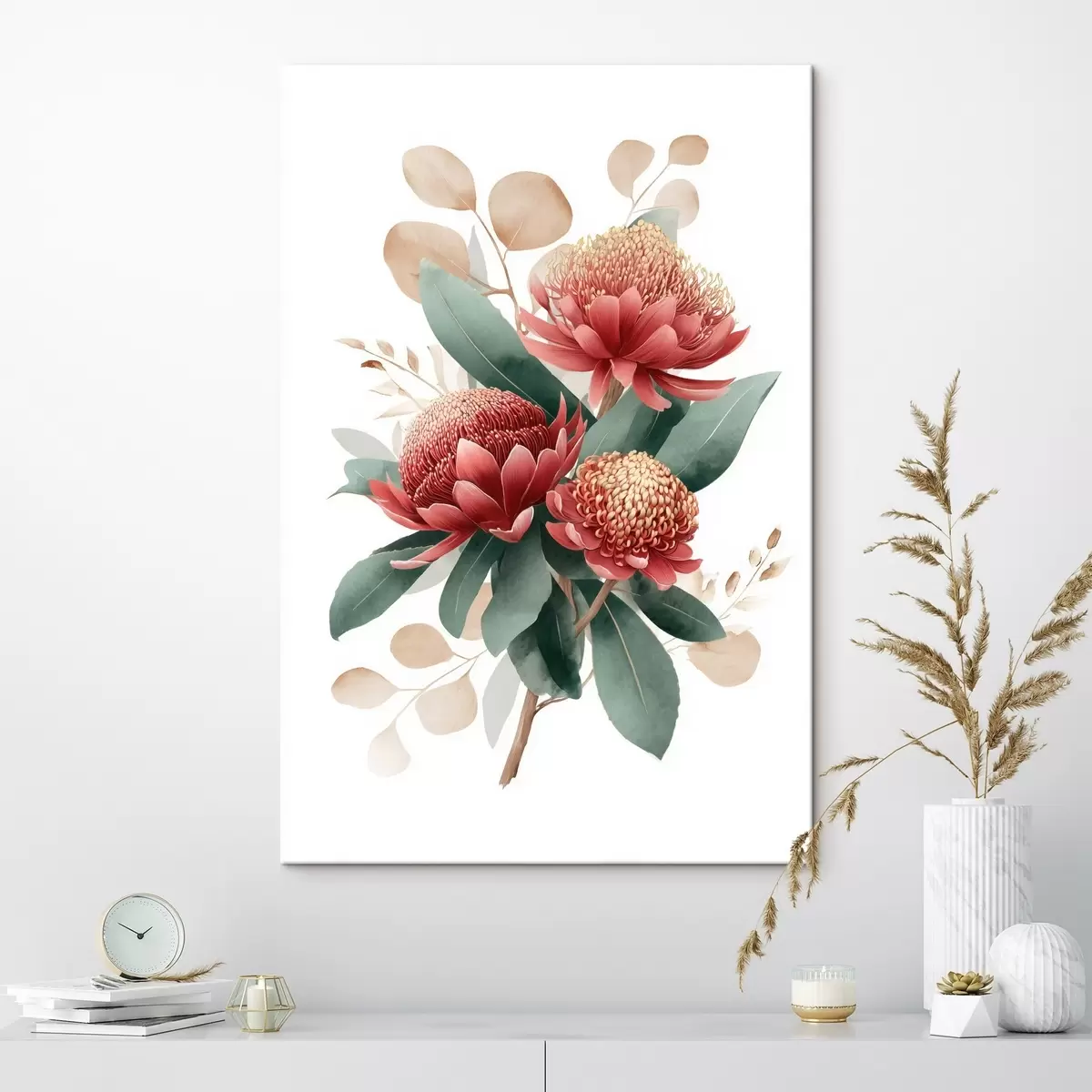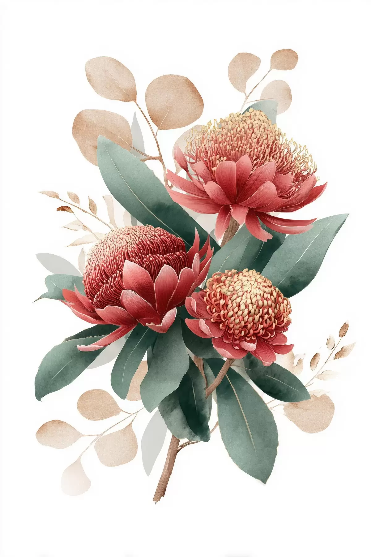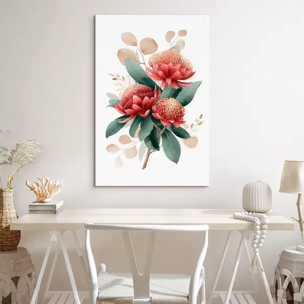 Tableau Bouquet expressif composé de protéas et de feuillages décoratifs dans un style illustratif moderne. s46954