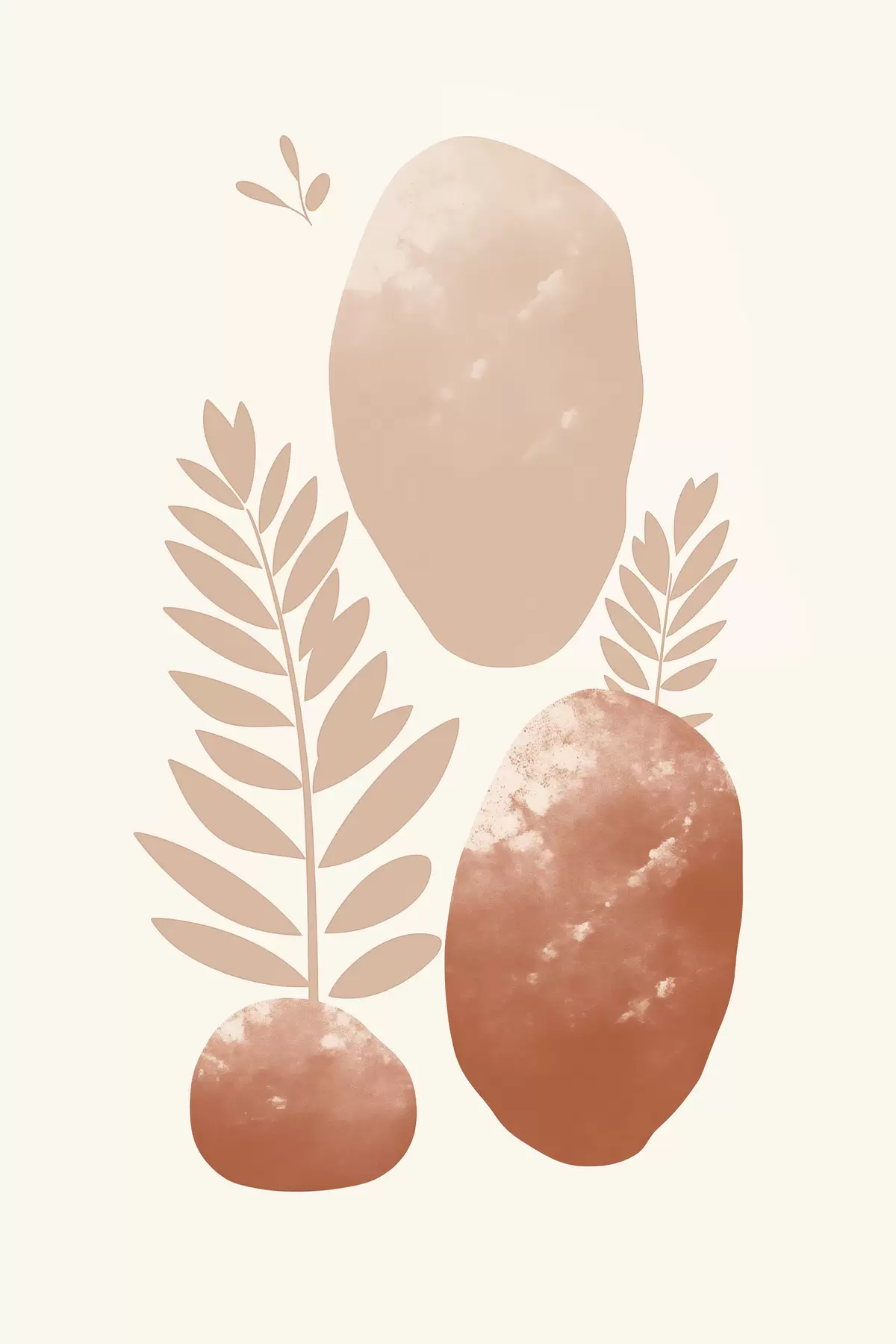 Tableau Formes abstraites, pierres texturées et feuilles dans des tons pêche et terre cuite discrets, minimalistes, fond crème. s47012