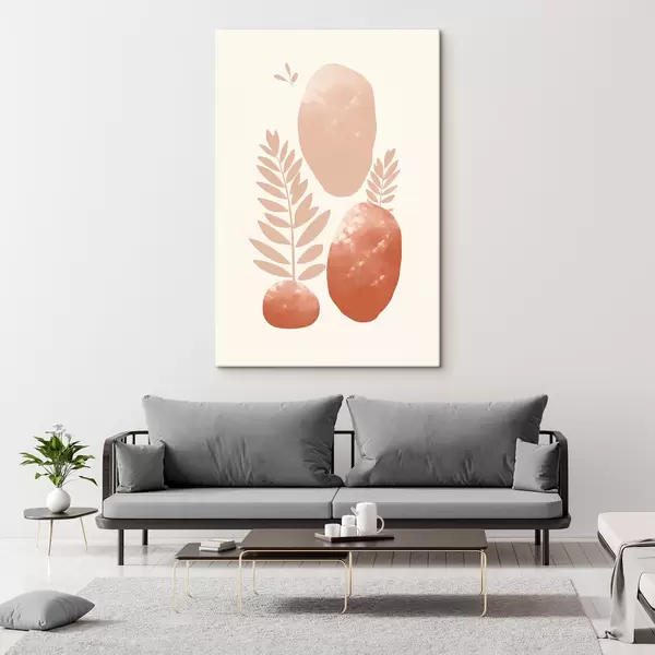 Tableau Formes abstraites, pierres texturées et feuilles dans des tons pêche et terre cuite discrets, minimalistes, fond crème. Nr s47012