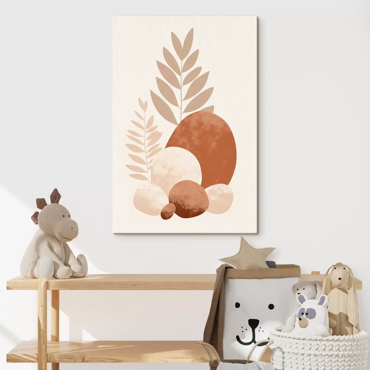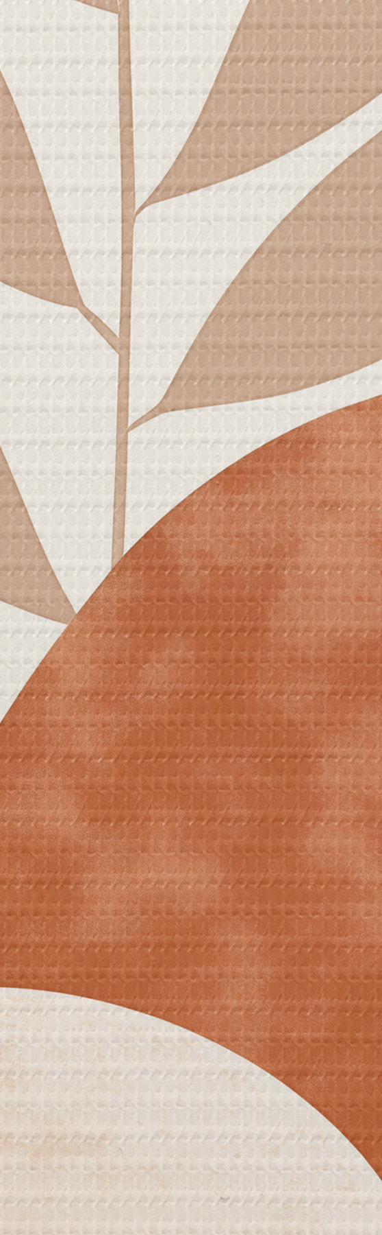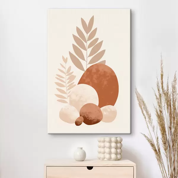 Tableau Formes abstraites, pierres texturées et feuilles dans des tons pêche et terre cuite discrets, minimalistes, fond crème. s47013