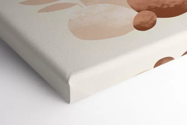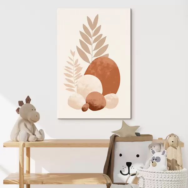Tableau Formes abstraites, pierres texturées et feuilles dans des tons pêche et terre cuite discrets, minimalistes, fond crème. Nr s47013