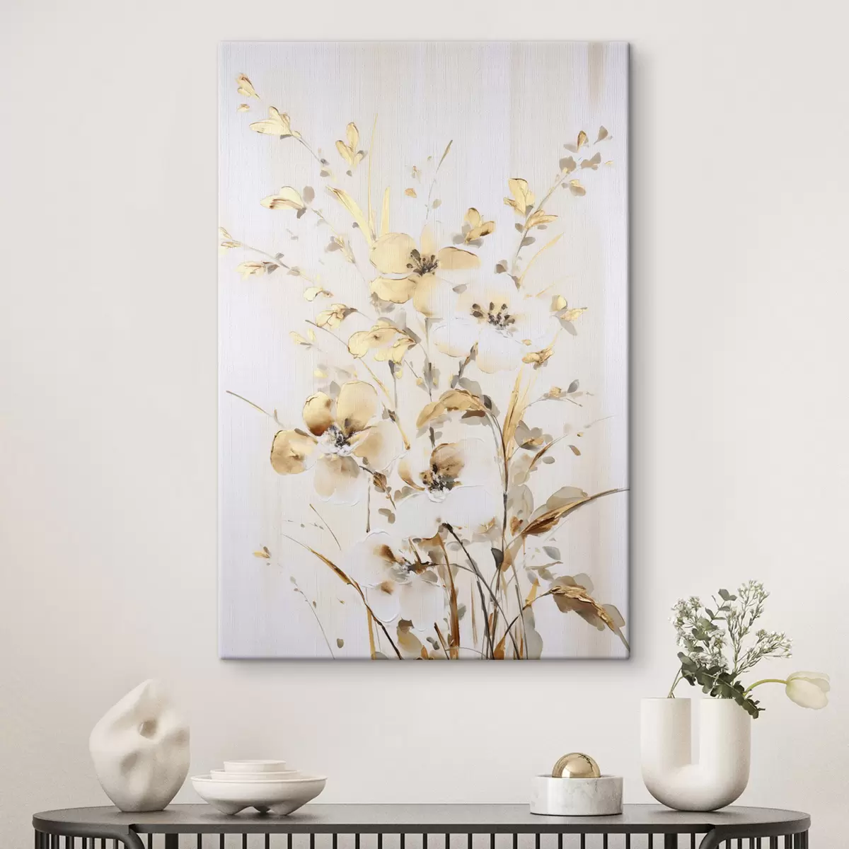 Tableau Fleurs et feuilles jaunes texturées sur fond blanc, avec des coups de pinceau délicats s47017