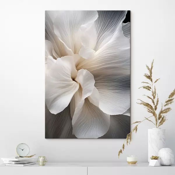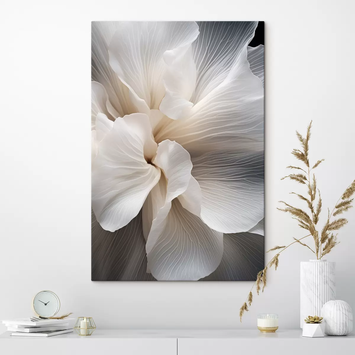 Tableau Gros plan sur de délicats pétales de fleurs blancs abstraits aux lignes complexes et au fond sombre flou s47018