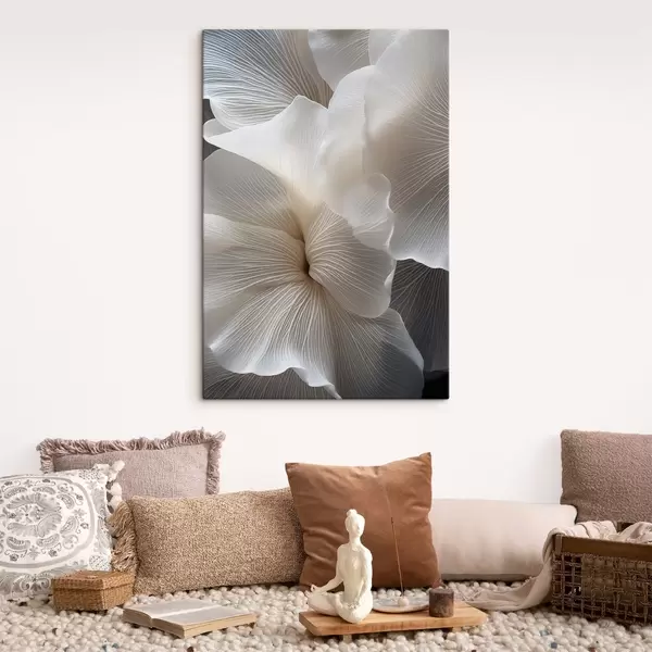 Tableau Gros plan sur de délicats pétales de fleurs blancs abstraits aux lignes complexes et au fond sombre flou s47019