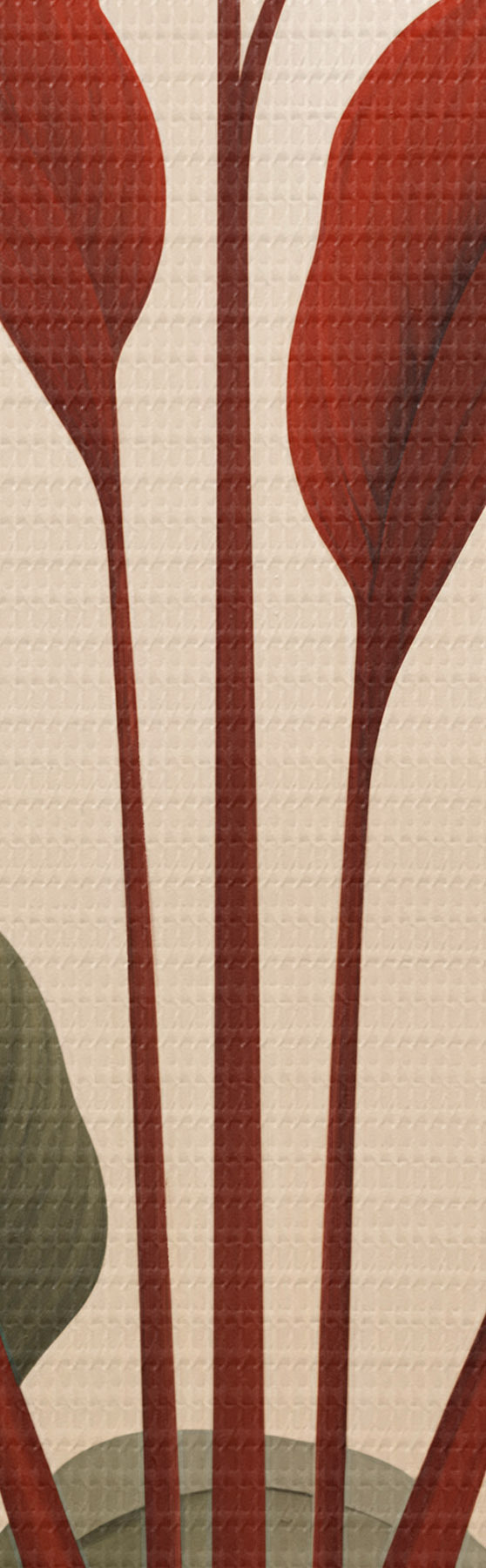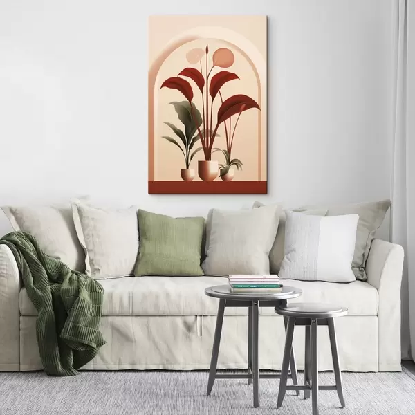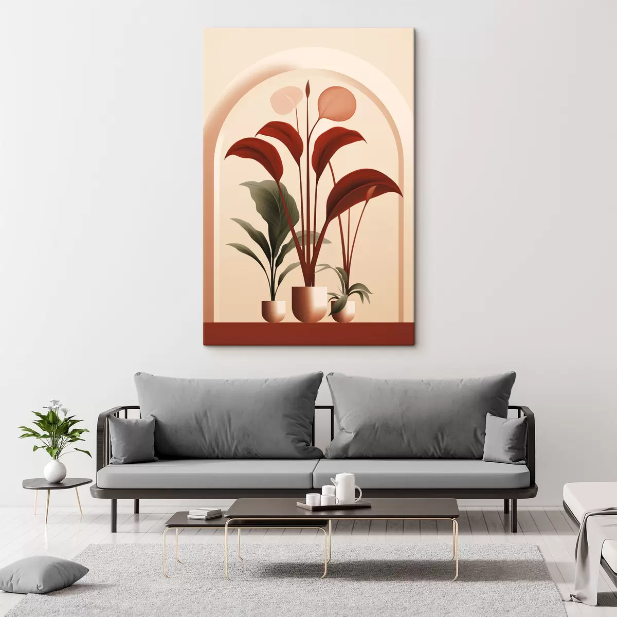 Tableau Plantes en pot abstraites avec de grandes feuilles vertes et rouges devant une arche de couleur crème. Nr s47033