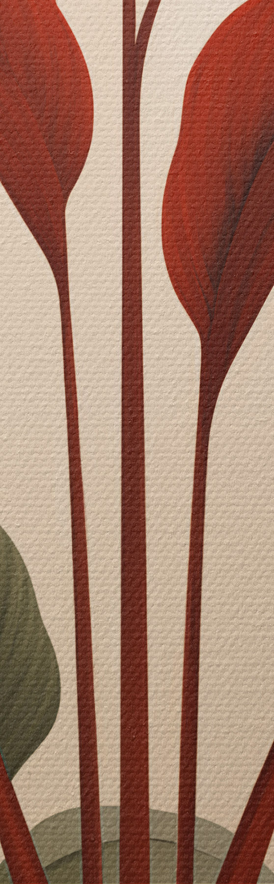 Tableau Plantes en pot abstraites avec de grandes feuilles vertes et rouges devant une arche de couleur crème. s47033