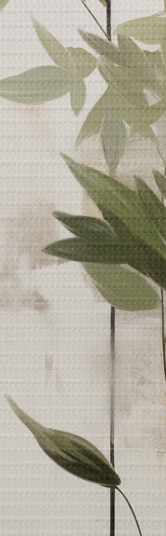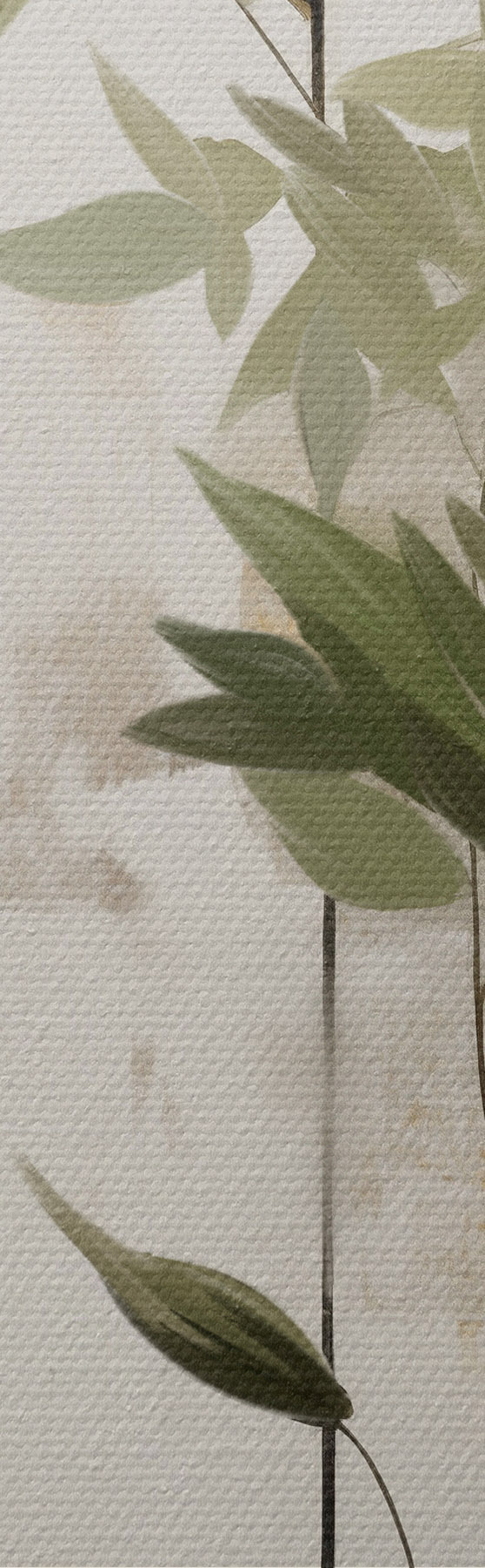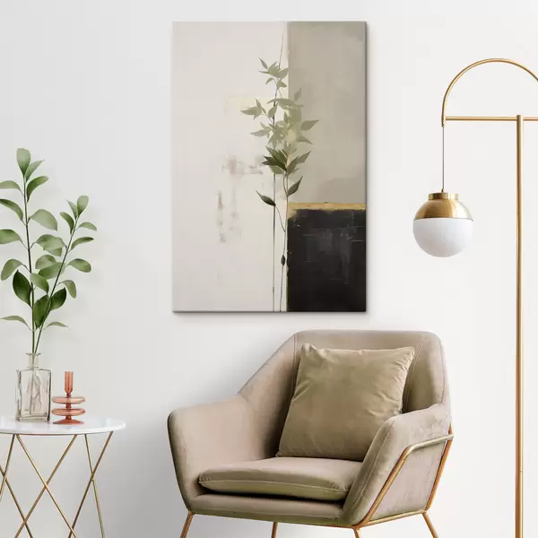 Tableau Une peinture minimaliste texturée représentant un vase avec des feuilles vertes sur fond de formes géométriques abstraites. Nr s47037