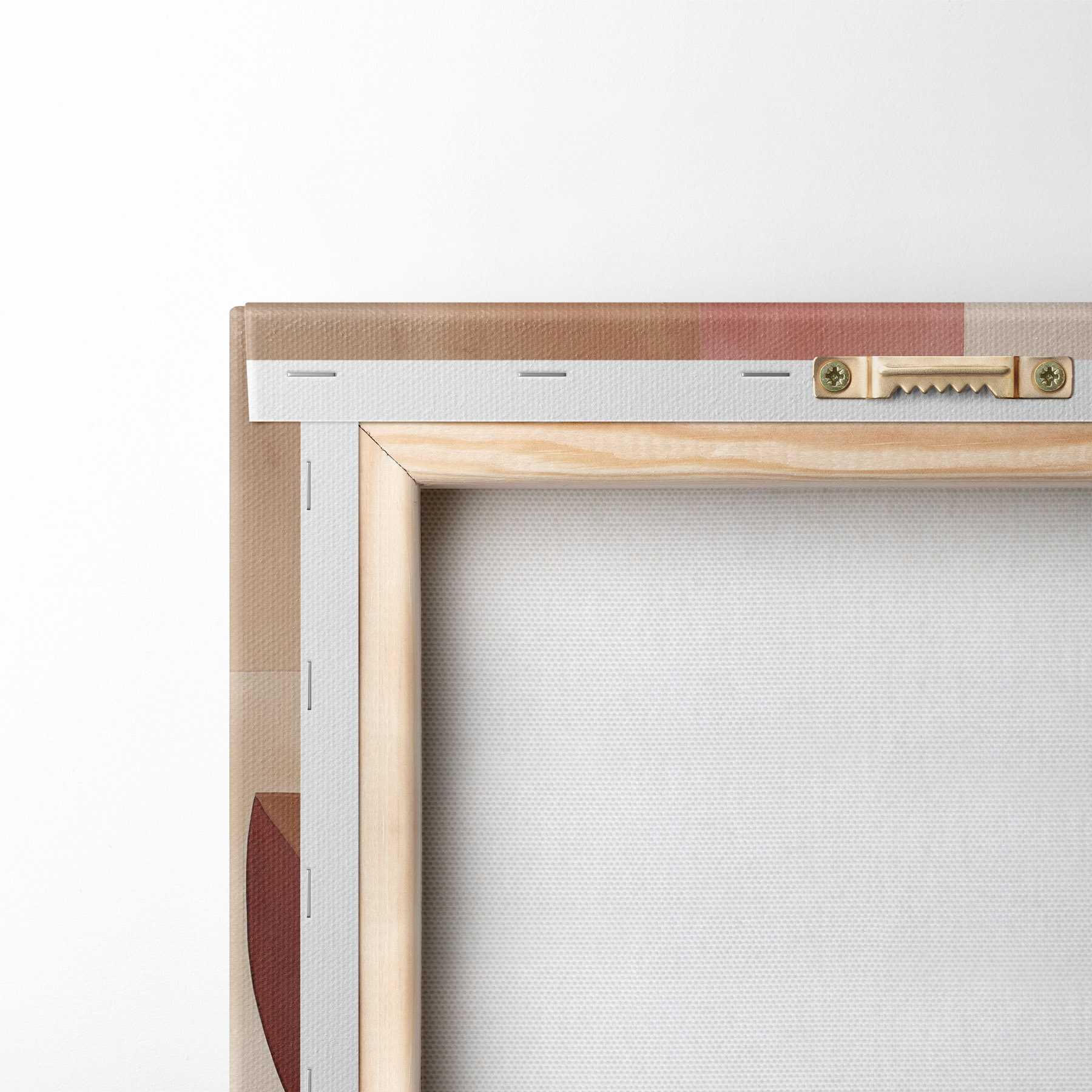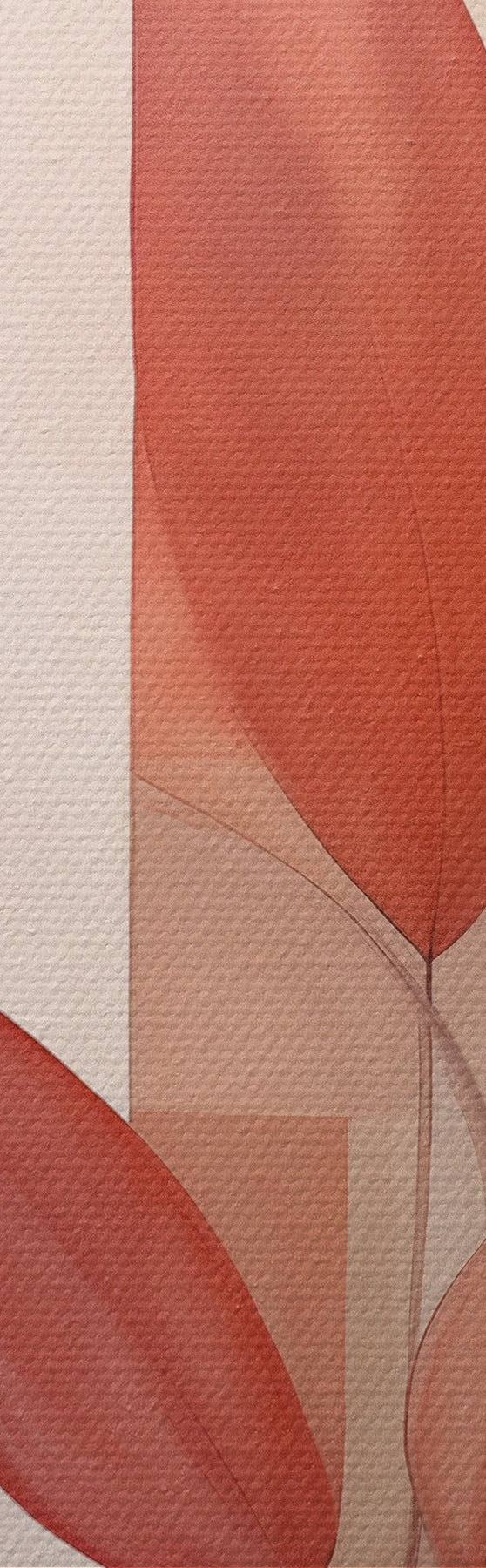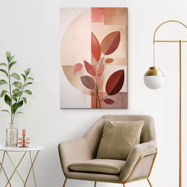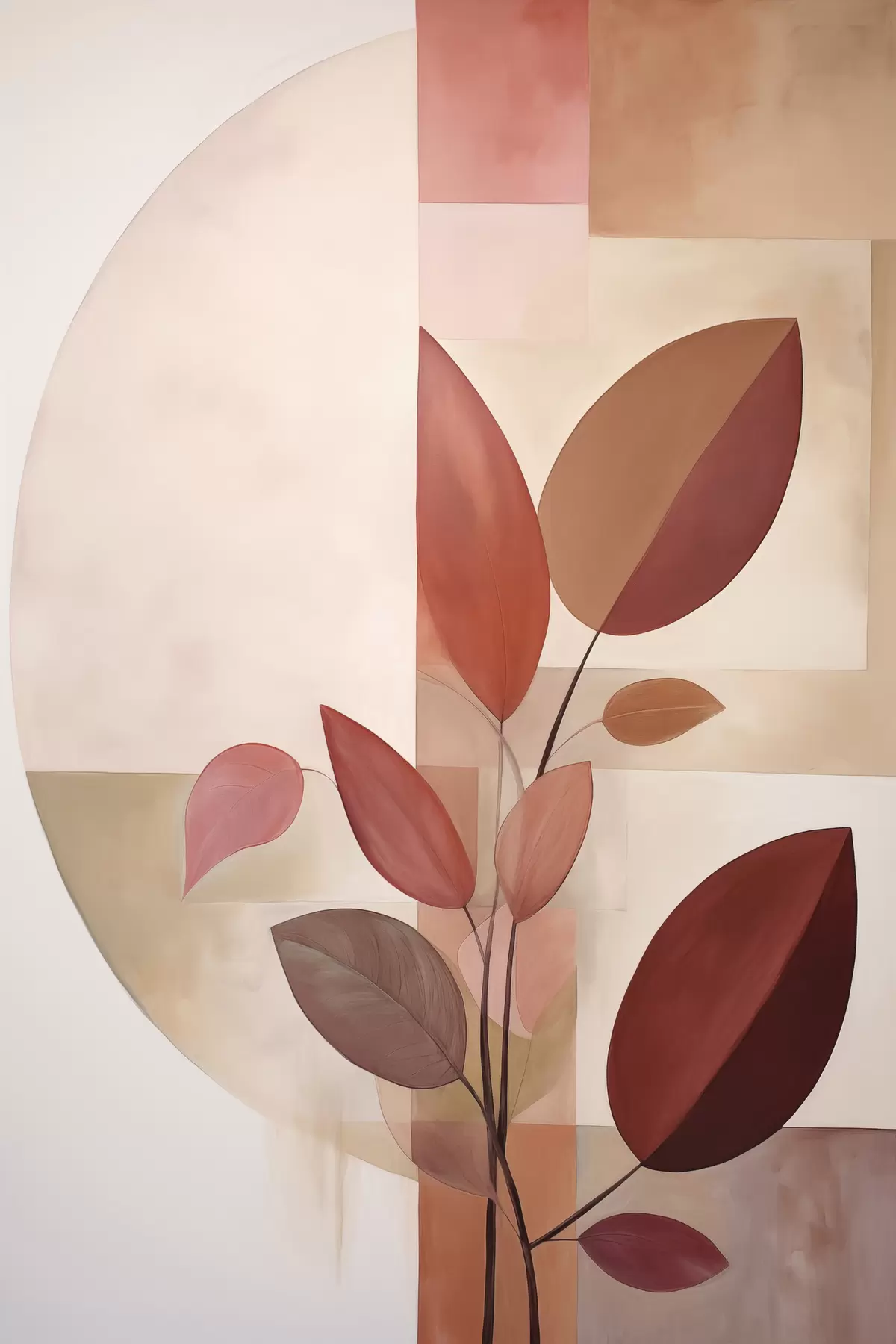 Tableau Plante abstraite aux feuilles rouges sur fond de formes géométriques et de couleurs douces et discrètes s47041