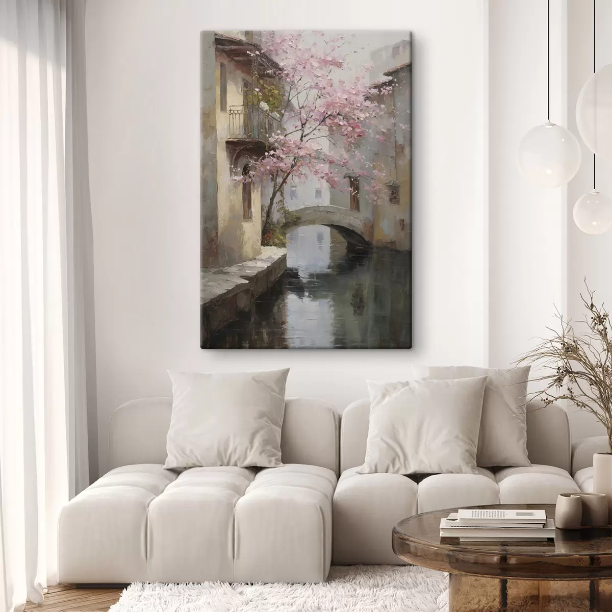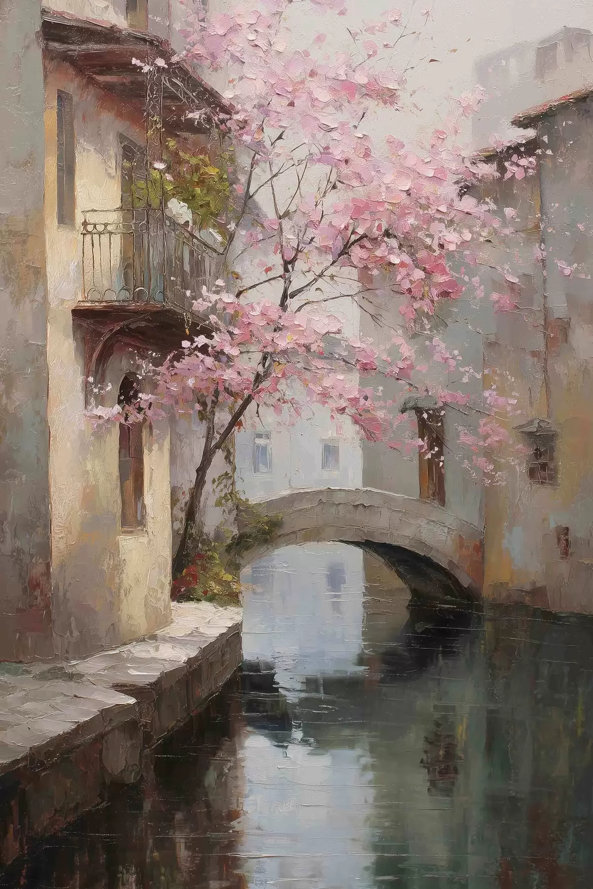 Tableau paysage urbain romantique avec un arbre en fleurs dans le style d'une peinture à l'huile s47126