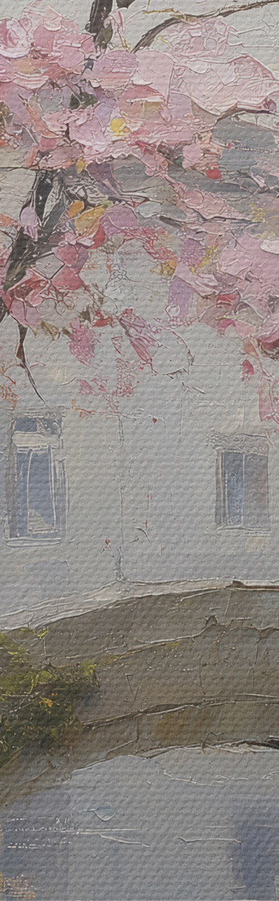 Tableau paysage urbain romantique avec un arbre en fleurs dans le style d'une peinture à l'huile Nr s47126