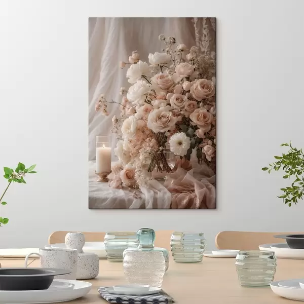 Tableau Fleurs crème à côté d'une bougie allumée s47281