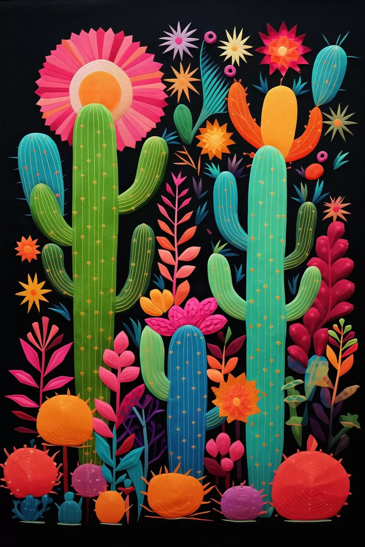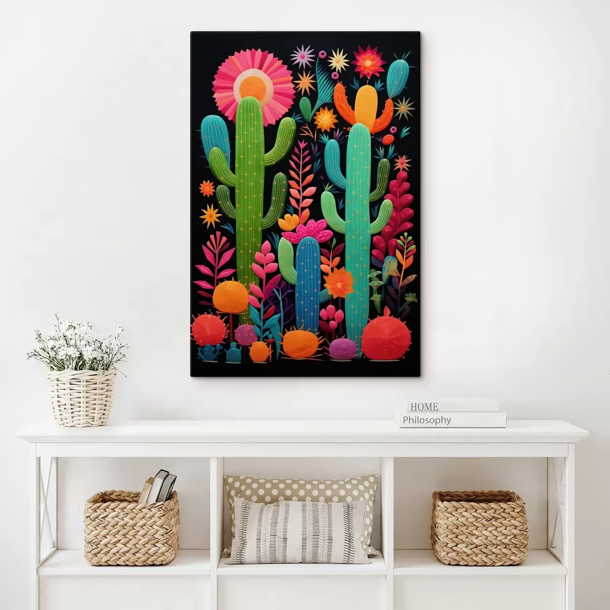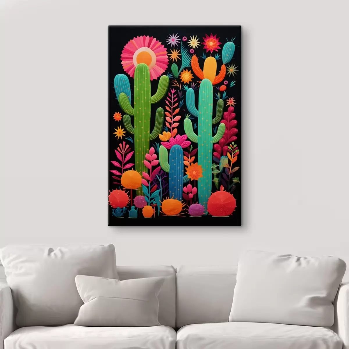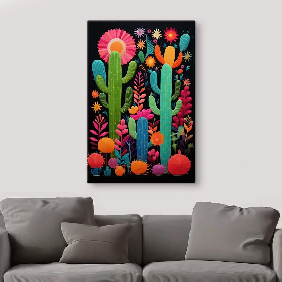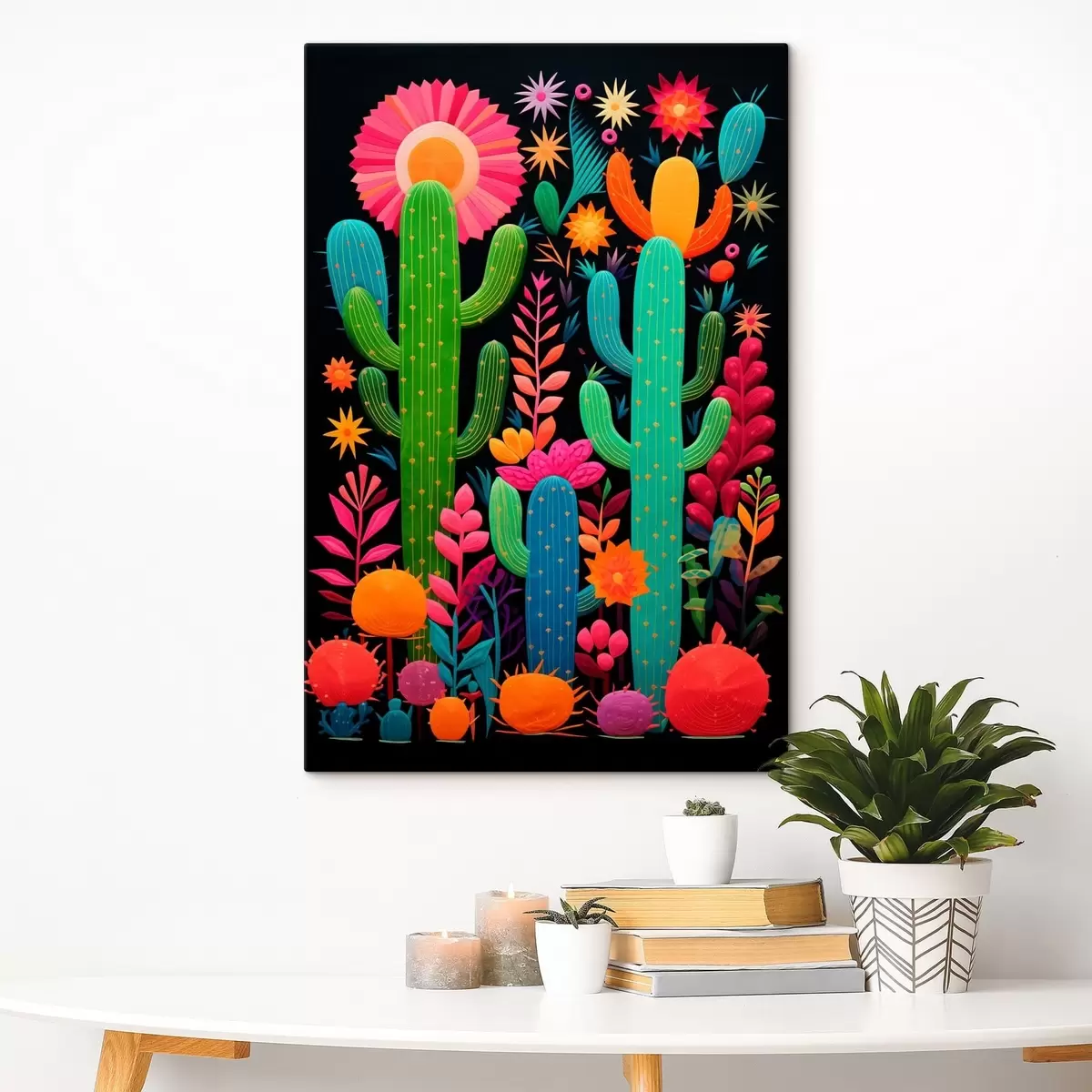 Tableau Cactus et fleurs éclatants sur fond sombre s47297